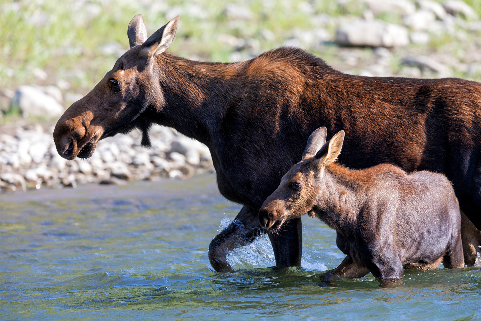 My favorite wildlife experience in late July hardly even required me to get off my couch.  One evening in my apartment I heard some of my neighbors whispering excitedly:  “Moose!”  I took a few steps towards my back door and immediately saw a moose mom with a calf wading in the Yellowstone River only about 100 feet away.  They casually took a drink in the late-day sun before sauntering slowly to the opposite shore and vanishing into the trees.