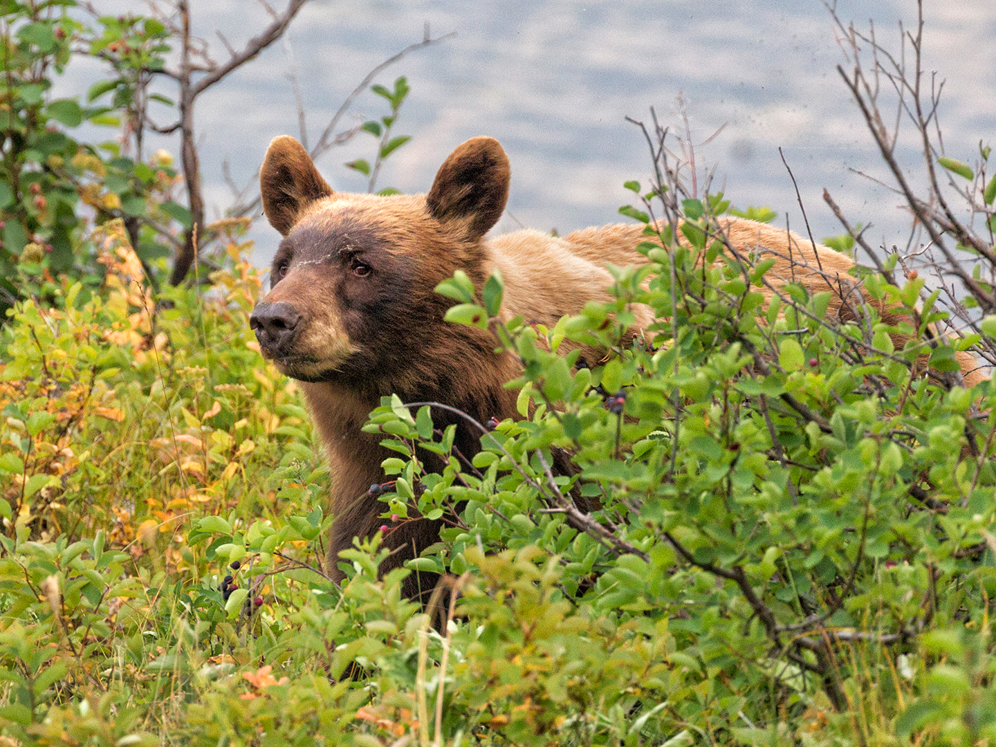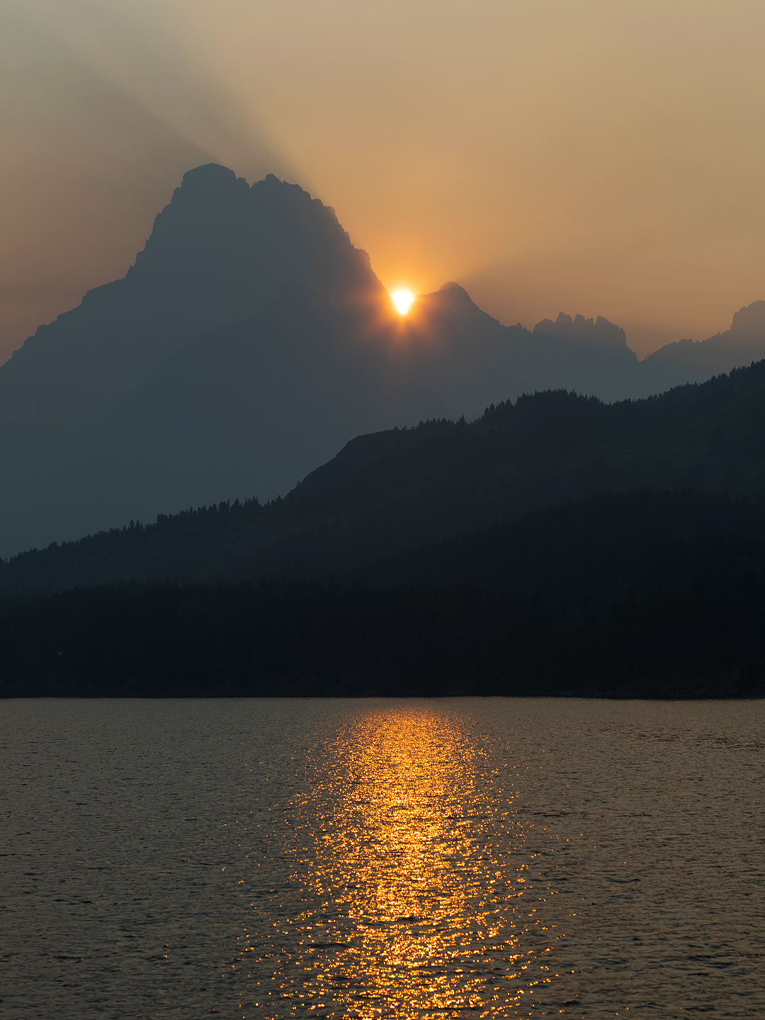 Near the middle of the month I made another trip to Glacier National Park, this time to camp for a night, take pre-dawn photos at Swiftcurrent Lake, and hike to Iceberg Lake.  The camping went fine, but the photos and hike were a bust.  Conditions for morning photos were poor, thanks to wind, clouds, and smoke from a wildfire on the western edge of the park.  And when I reached the trailhead for Iceberg Lake I found it blocked by a “Closed” sign – apparently there was too much bear activity in the area.  (When I told Marie she said, “But you like bear activity.)  I did get to see a lot of bears.  And the wildfire smoke made for an interesting sunset.