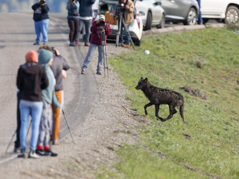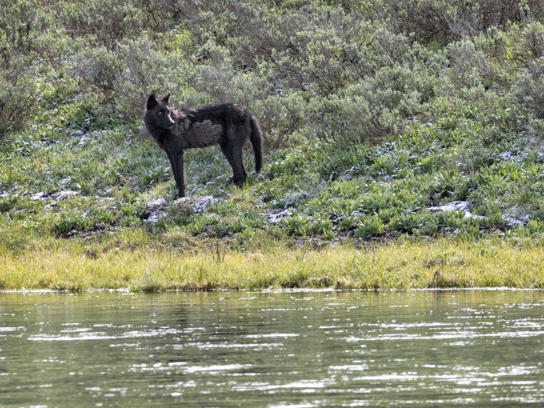 For the next four nights I stayed in Gardiner, Montana, just outside Yellowstone’s northern entrance. I started most mornings in Hayden Valley, where the Wapiti wolf pack had been making regular appearances at sunrise, and I managed to find them twice. At one point I watched as a young black Wapiti wolf on the other side of the Yellowstone river decided to swim over to my side, sprint through a marshy field, and then dart across the road between groups of thrilled photographers.