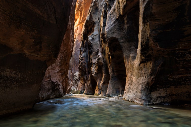 I decided to compromise. I set my alarm for 3:45am and drove into the park a little after 4am. There were already more than 60 cars in line ahead of me. Thankfully not all of them were headed to The Narrows, and most of those who were needed some time to prepare before heading out. As soon as I reached the parking lot at the Temple of Sinawava I bolted onto the trail that leads to The Narrows and quickly passed the only people in front of me. I was the first one to reach the point where the Virgin River itself becomes the trail, and for almost the entire hike upriver I was joyfully alone.