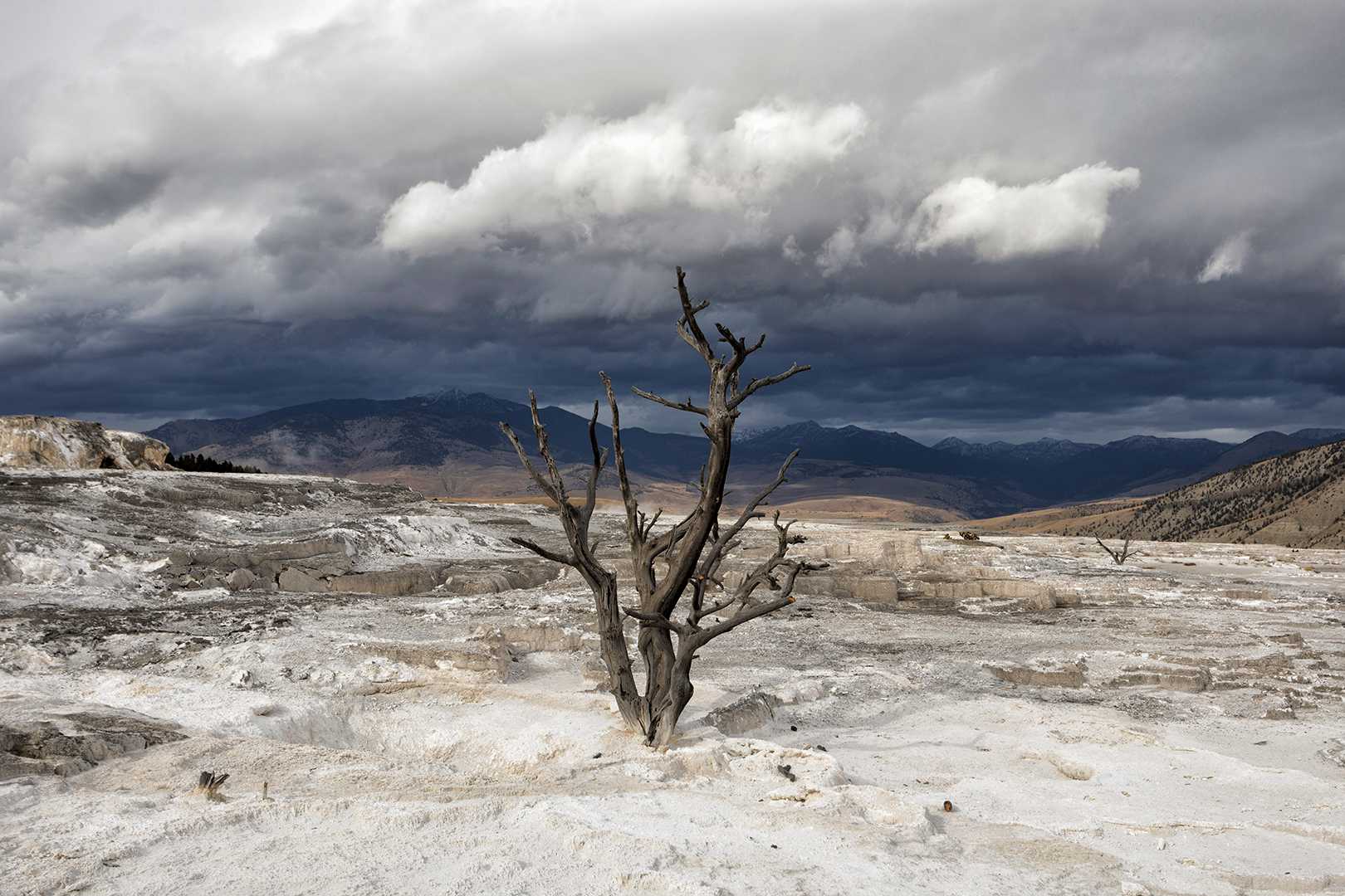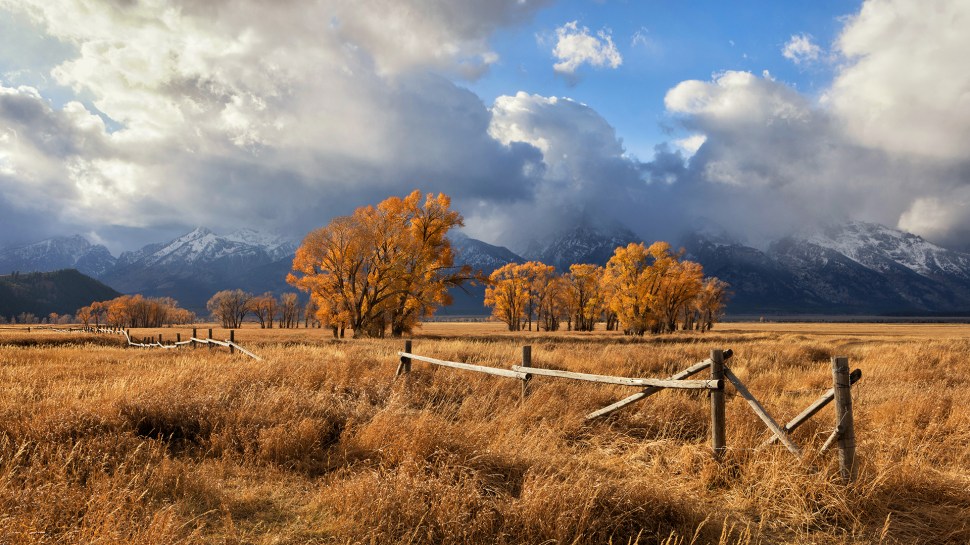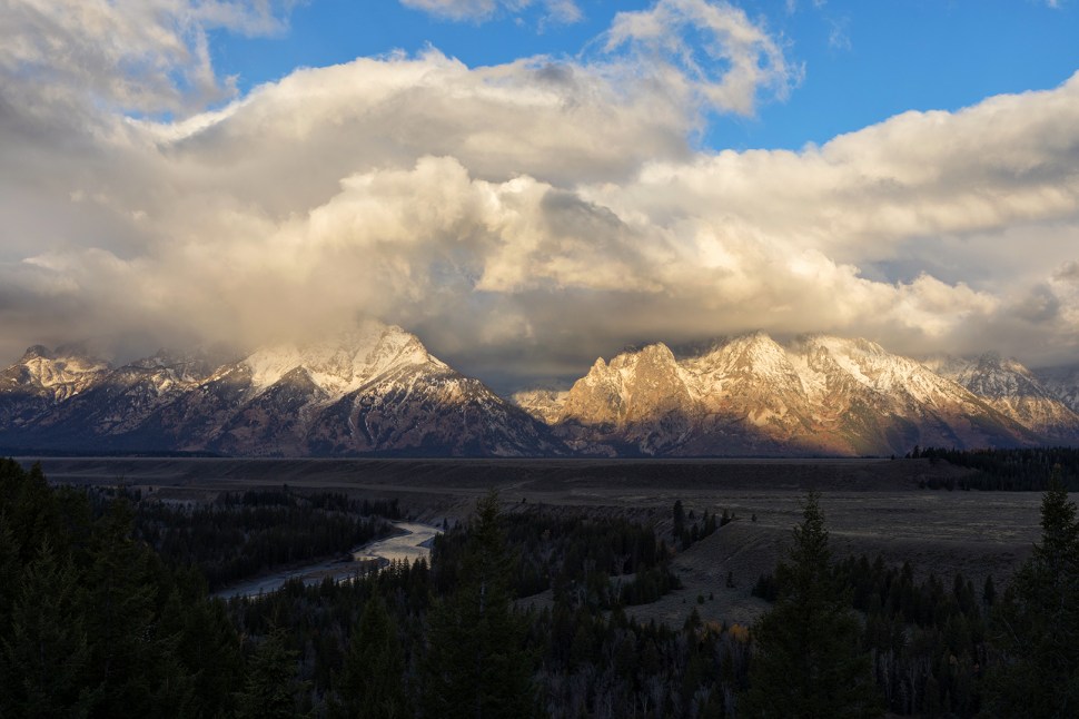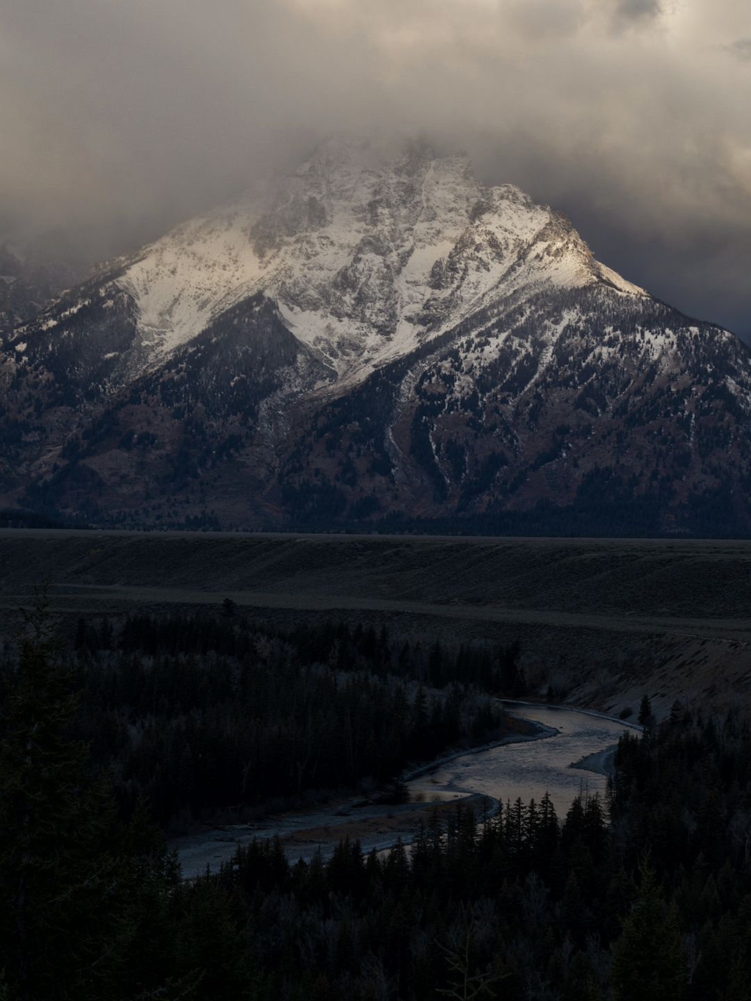 In early October I decided to make a relatively quick trip to Yellowstone. The drive to Jackson, Wyoming is only about seven and a half hours from Longmont, and I arrived early enough to catch the late afternoon light at Mormon Row, just inside Grand Teton National Park. A cold front had moved in that morning and dramatic clouds whirled over the iconic mountains, only occasionally allowing the sun to break through.