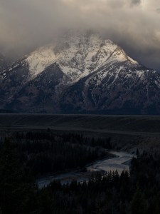 Roiling clouds continued hiding the mountaintops the next morning. After a quick stop at the Snake River Overlook I continued my apparently ill-fated search for grizzly bear 399 and her cubs, again without any luck, and then headed north into Yellowstone.