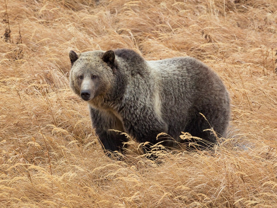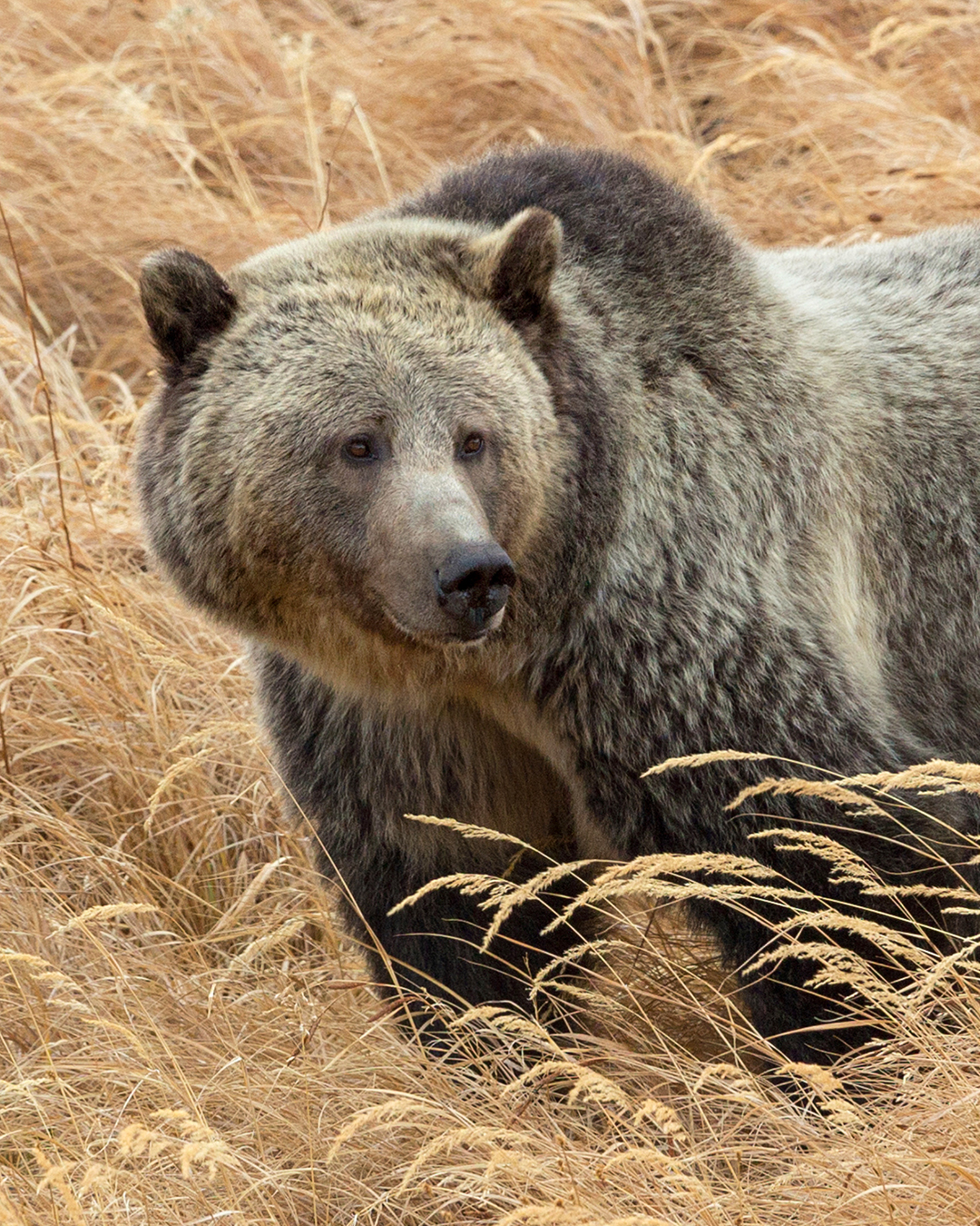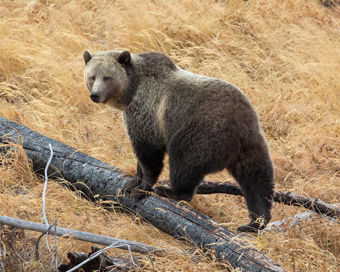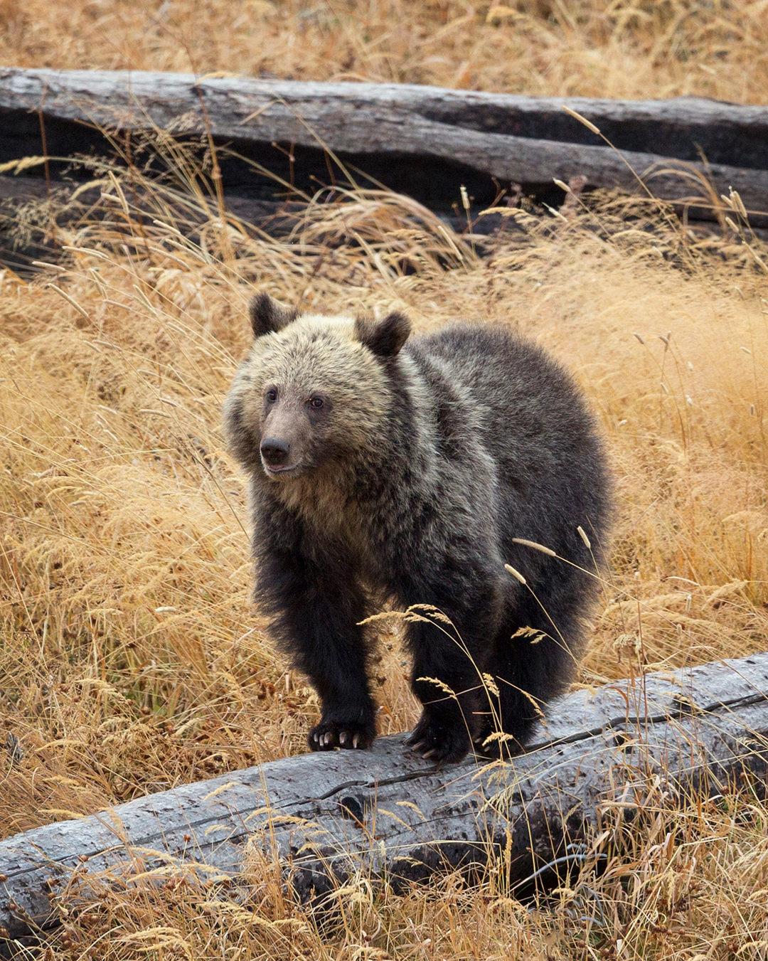 At Fishing Bridge I turned right, wondering if the grizzly bear Raspberry might be hanging out in her normal stomping grounds on the east side of Yellowstone Lake. And sure enough, there she was, foraging in the tall yellow grass and burned-out trees just south of the road. I joined a line of other photographers and got my first look at her new cub.