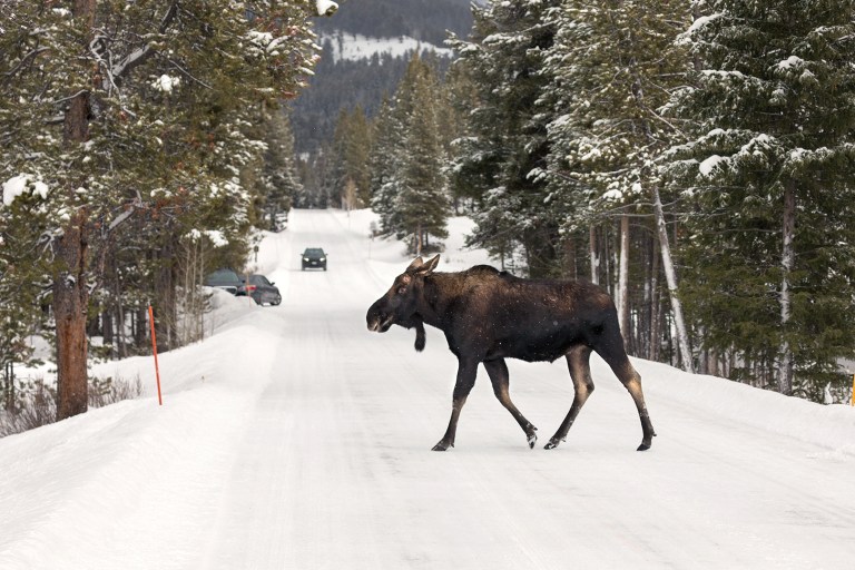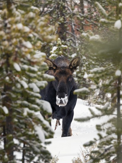 Near Pebble Creek I spotted a moose about 100 yards from the road. I parked at the next pullout and walked back to get some photos as the moose appeared and disappeared behind snow-covered pine trees. The moose was casually moving towards the road, still well over 25 yards away, when suddenly it bolted into a sprint, parallel to the road, first in one direction and then wheeling around the opposite way. I froze.