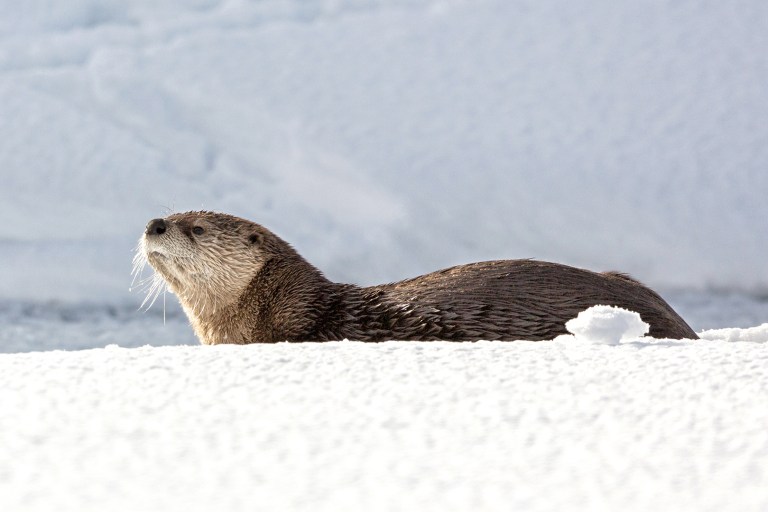 Driving in the park not long afterwards, my mind still spinning furiously with thoughts of the cabin, I noticed a few small figures with cameras out by the edge of the mostly-frozen Lamar River. Maybe they had an otter? It had been two years since I’d seen one. I bundled up as quickly as I could, shouldered my big camera, and hiked out through the snow. Sure enough, there was an otter relaxing on the ice by an open patch of water, watching the encroaching paparazzi with tolerant nonchalance. The otter indulged us for about a half hour before a few overly eager photographers ventured too close and sent it back underwater and out of sight. What luck to have stumbled across one of my favorite animals!