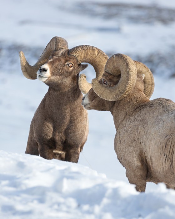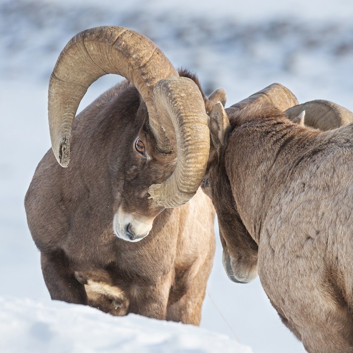 Most mornings the sheep stay higher up, but as the day goes along they often come closer to the road, and one afternoon in February I happened to be at Confluence when a couple of rams dropped all the way down to graze by the Lamar River.  After a while they took a break from grazing for a friendly round of head-butting, and I was in a good spot to catch the instigator flashing some stink-eye at his buddy before making a horns-first lunge.