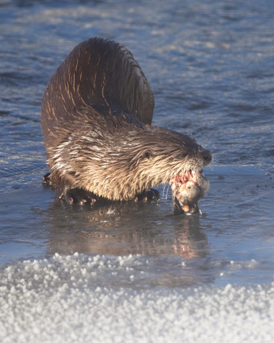 Temperatures in February dropped to lows I’d ever experienced.  Just after sunrise one morning my car said it was -38F in Lamar Valley, which wasn’t cold enough to deter a group of three otters from popping out of their den at Confluence to find breakfast.  Their whiskers froze into icicles whenever they left the water.  I’d apparently just missed one of the otters catching a goldeneye duck, which it proceeded to devour on the edge of the Lamar River.  Up until that point I’d only ever seen otters eat fish.