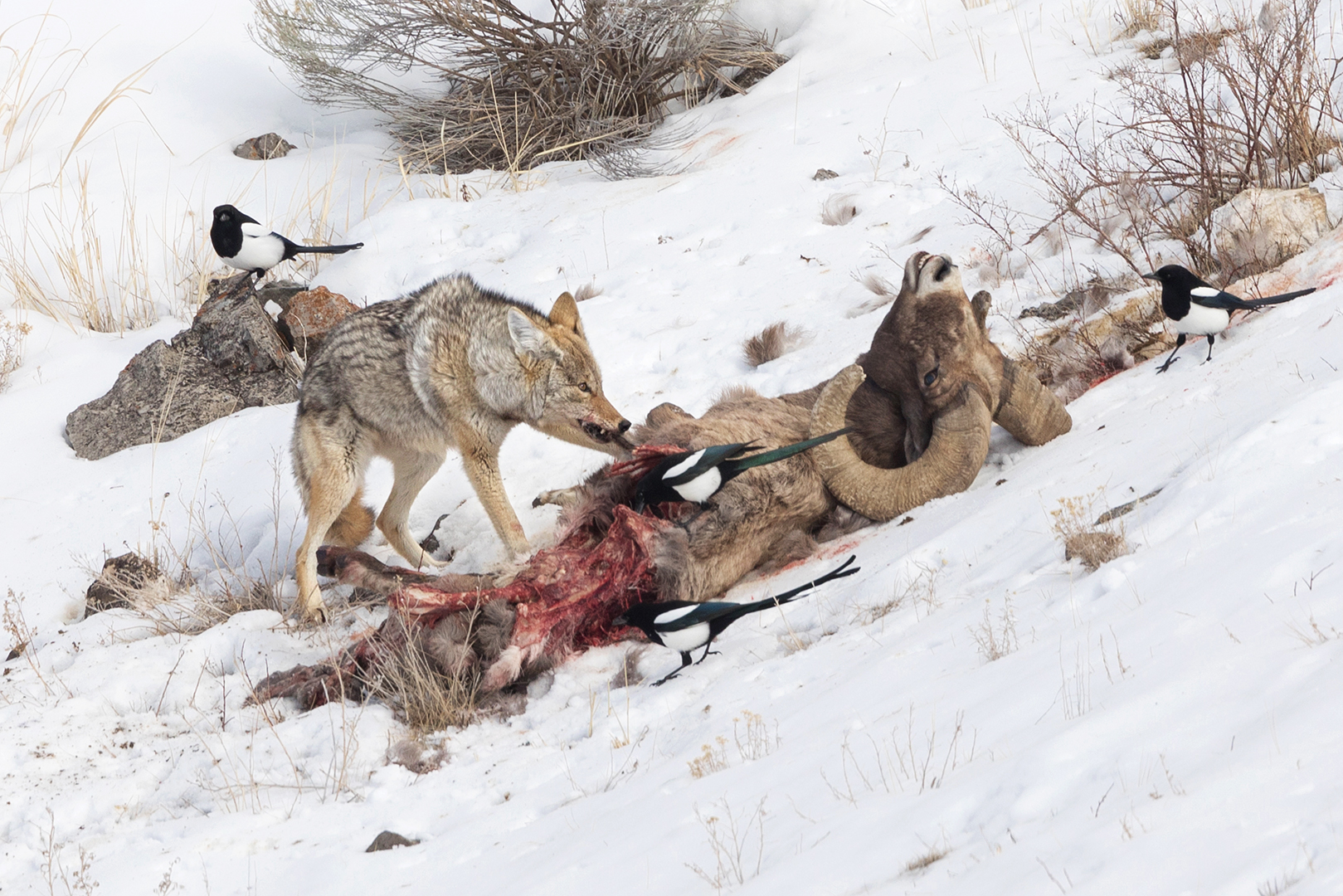 Coyote Feeding on a Bighorn Sheep Carcass