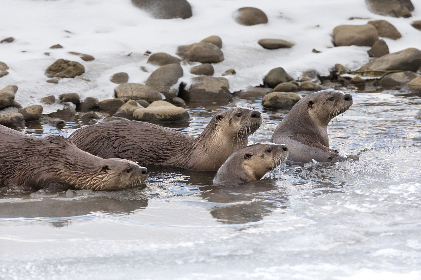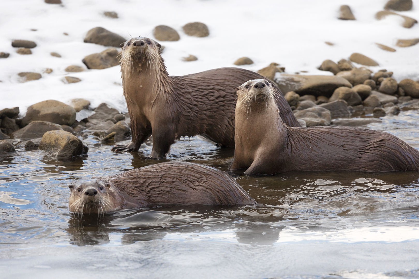 Three Otters on Frozen Lamar River in February