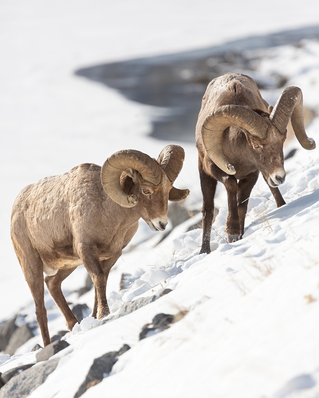 Most mornings the sheep stay higher up, but as the day goes along they often come closer to the road, and one afternoon in February I happened to be at Confluence when a couple of rams dropped all the way down to graze by the Lamar River.  After a while they took a break from grazing for a friendly round of head-butting, and I was in a good spot to catch the instigator flashing some stink-eye at his buddy before making a horns-first lunge.