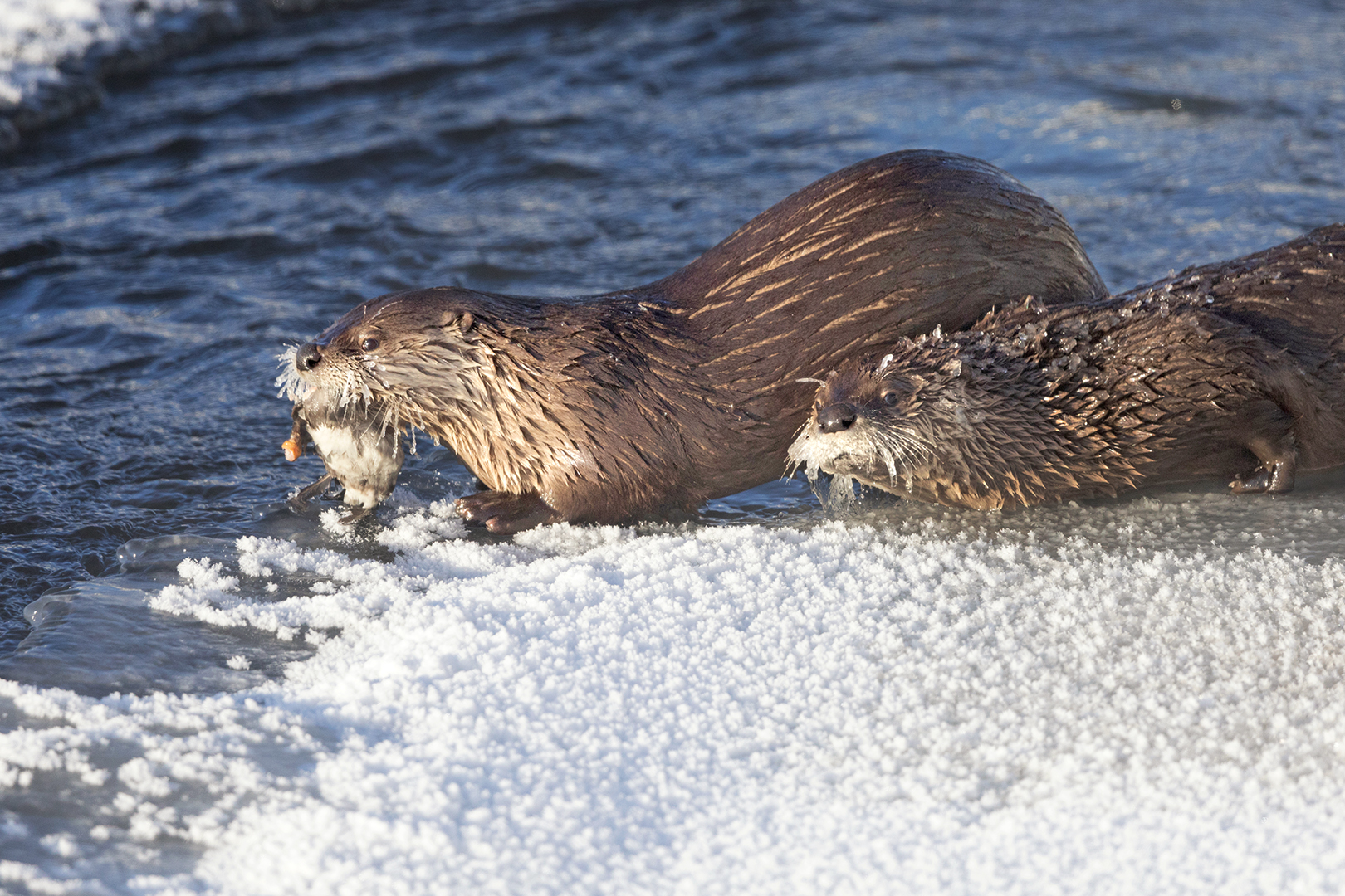 Temperatures in February dropped to lows I’d ever experienced.  Just after sunrise one morning my car said it was -38F in Lamar Valley, which wasn’t cold enough to deter a group of three otters from popping out of their den at Confluence to find breakfast.  Their whiskers froze into icicles whenever they left the water.  I’d apparently just missed one of the otters catching a goldeneye duck, which it proceeded to devour on the edge of the Lamar River.  Up until that point I’d only ever seen otters eat fish.