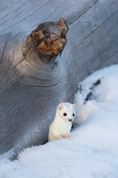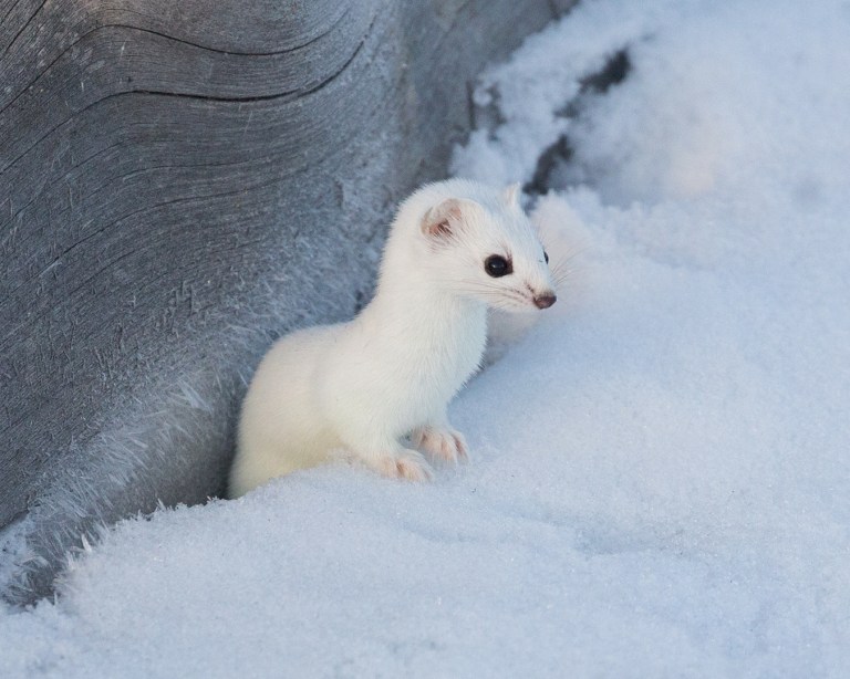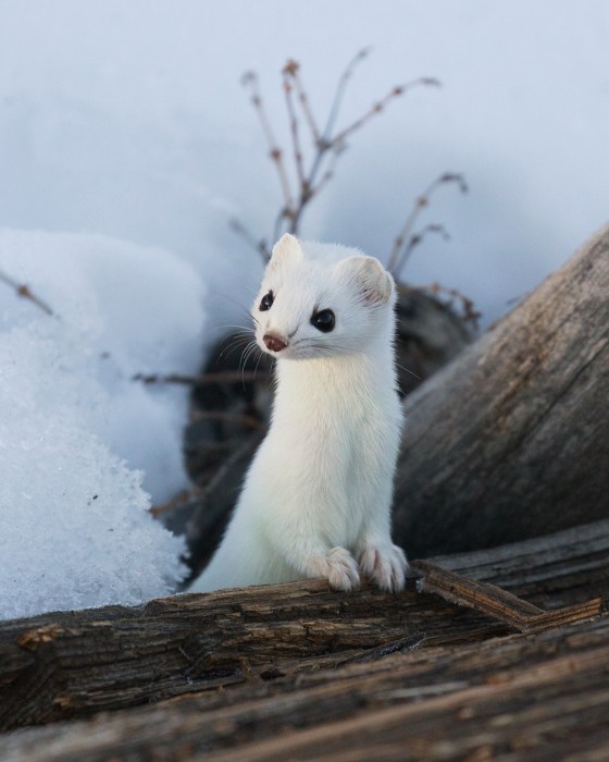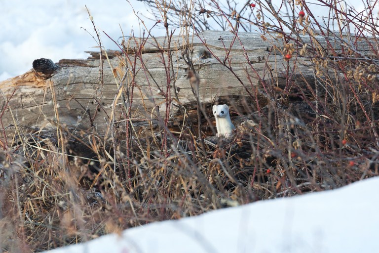 One morning I pulled up to the bear den and saw my photographer friend Shane sitting on the back of his truck. “Get your camera!” Shane blurted out with a muffled yell. “There’s a white weasel right here!” He didn’t need to tell me twice. Camera in hand, I hopped out of my car as quickly and quietly as possible and almost immediately saw a furry white blur no more than 10 feet down the slope from Shane’s truck. An ermine!