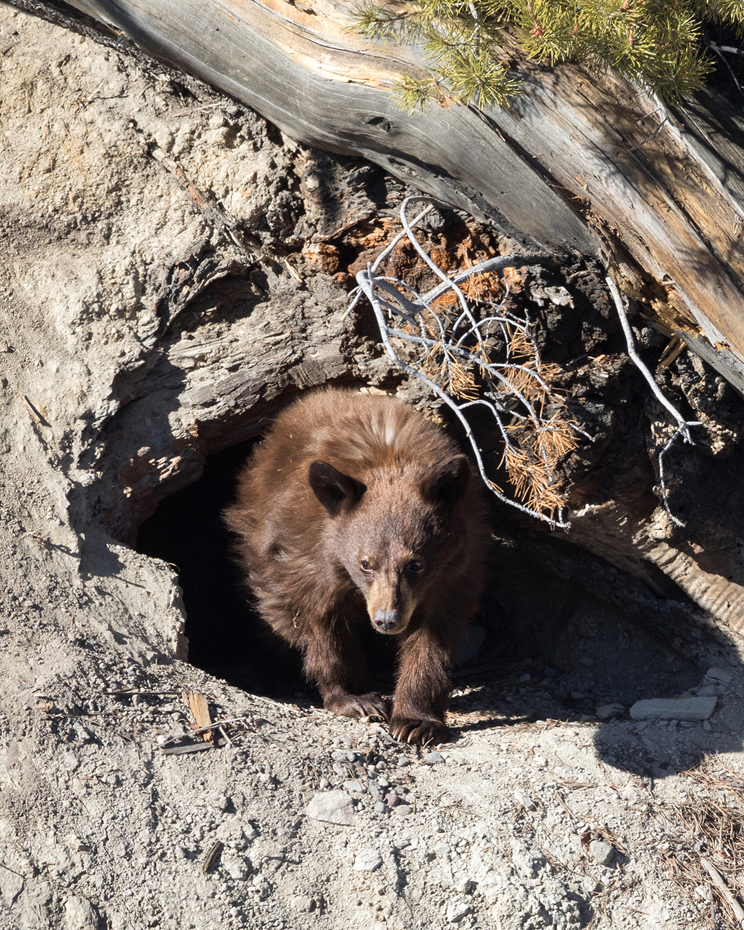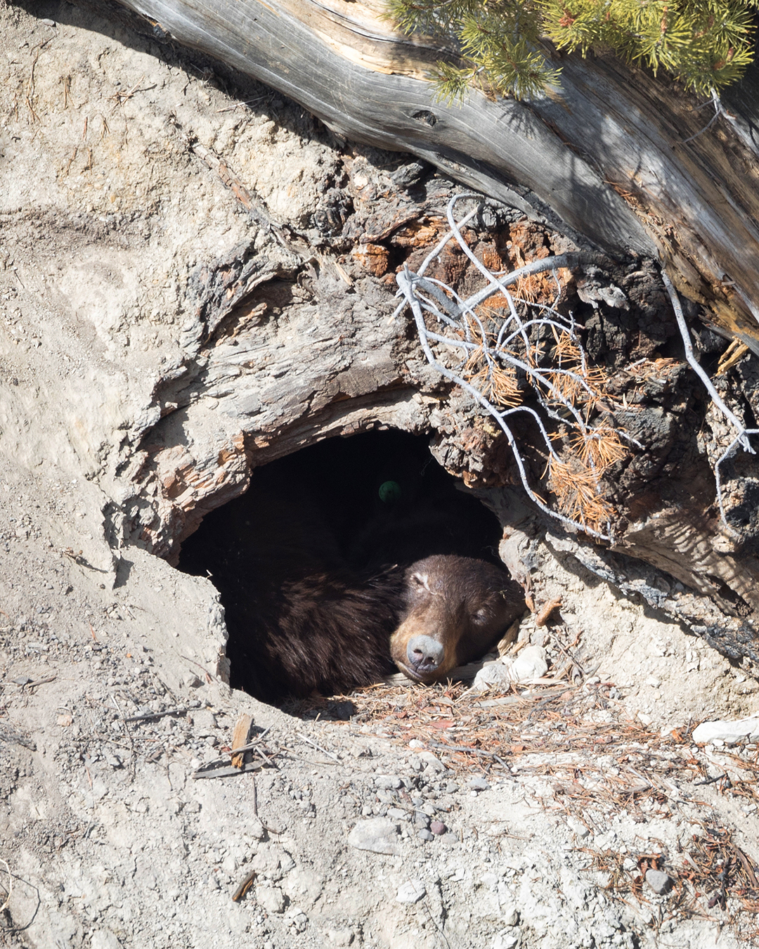 Kate also joined me for a few wildlife drives. We stopped at the black bear den by Tower Junction, and Kate was able to see the mom with her head at the den’s small opening. The bear mom and her cubs have been growing more active as temperatures rise, and often on particularly warm afternoons at least one of them popped out for some fresh air. People who know more than I do about bear behavior predict that they’ll leave their den for good in early April.