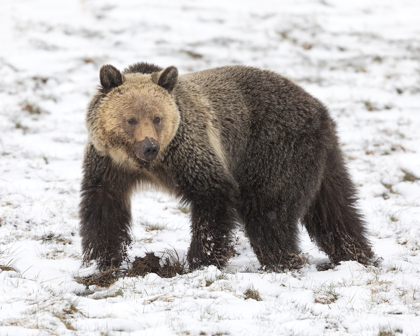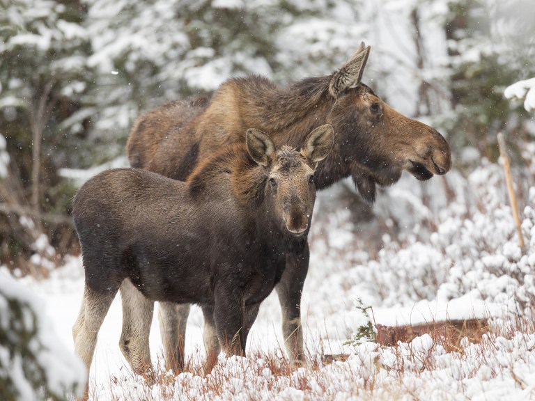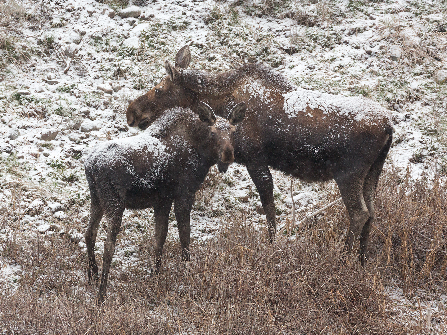 First up was my buddy David, a friend since high school, who came for a few days in the first half of the month. Despite unseasonably cold, snowy weather, we had a great time and managed to find just about all the wildlife we hoped for – grizzlies, black bears, wolves, foxes, coyotes, moose (in our back yard as well as the park), bighorn sheep, mountain goats, a badger, elk, bison, pronghorn, mule deer, marmots, and all kinds of birds.