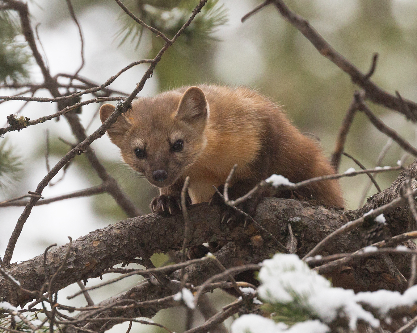 One of my favorite animals to see is the pine marten, but they’ve proven to be a lot more elusive than I expected. Back in January of last year Marie and I saw one when we checked out the cabin in Silver Gate that we eventually bought, and that gave us the impression that we’d find pine martens pretty regularly in our yard. Instead I’ve only caught fleeting glimpses of them inside Yellowstone, never long enough for a photo. But towards the end of May I finally found a marten kind enough to stand still for a few seconds.