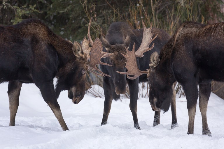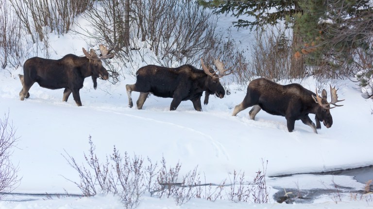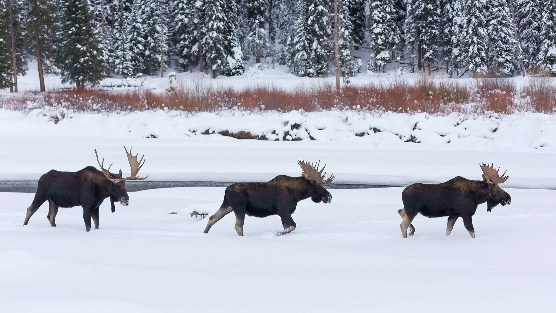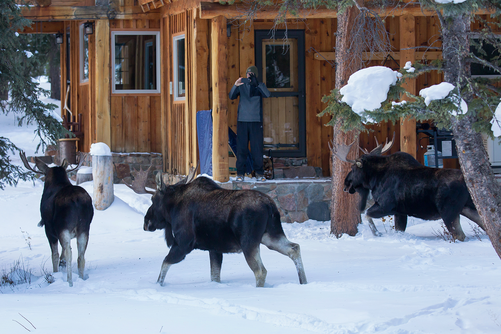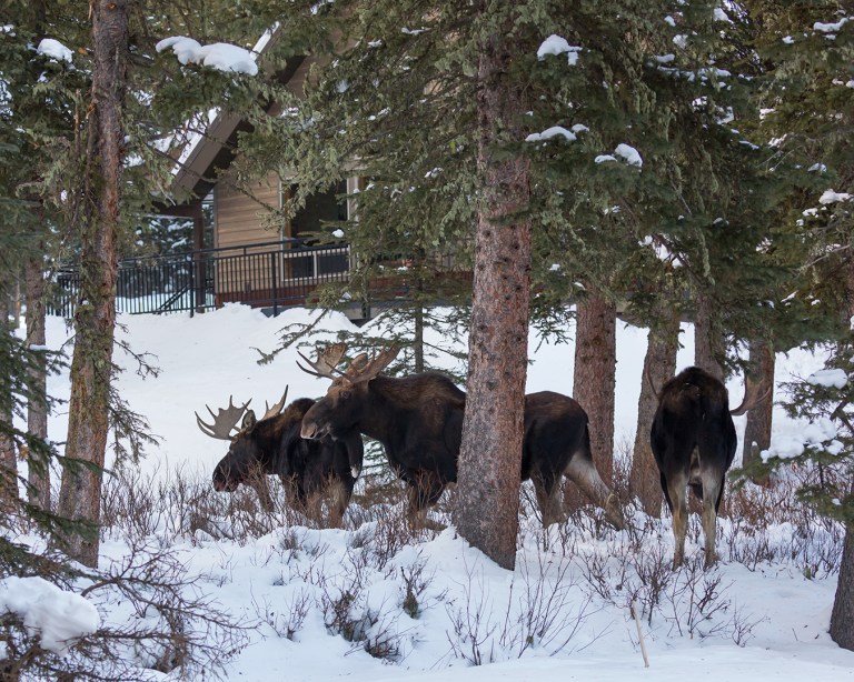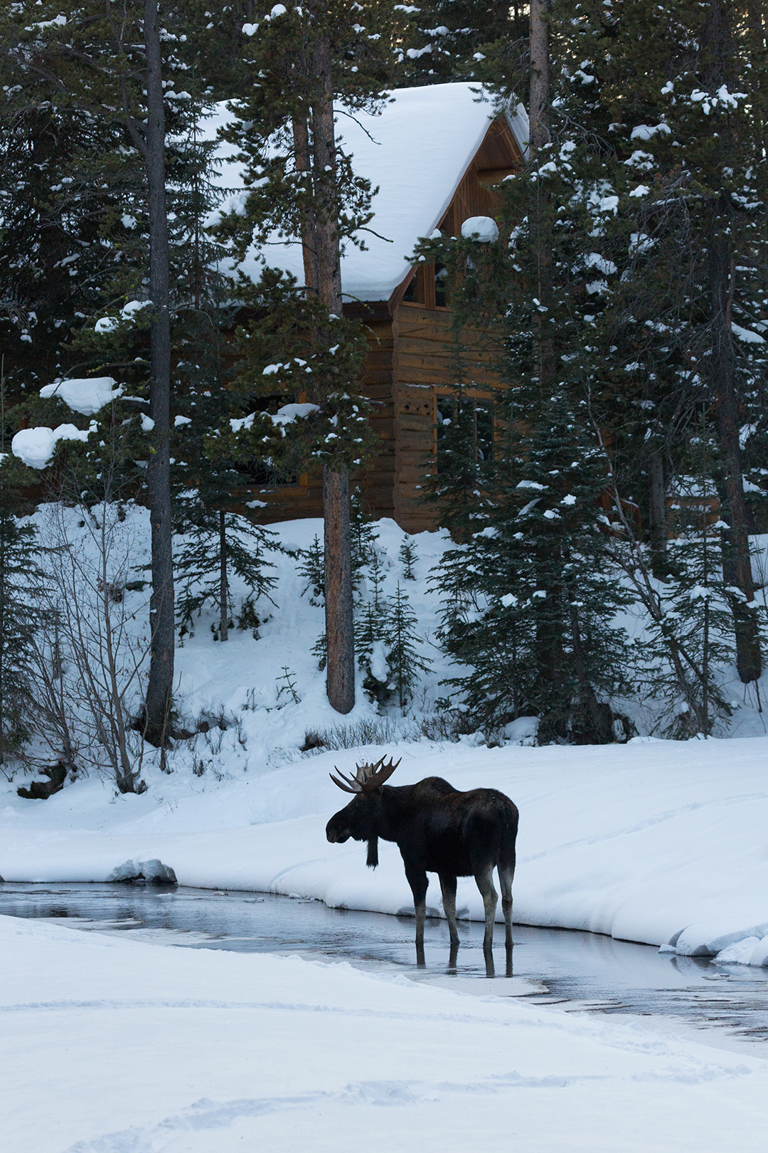 Later that day the three bull moose crossed the creek into our yard. I scrambled through deep snow to try and get a shot of them with our cabin in the background.