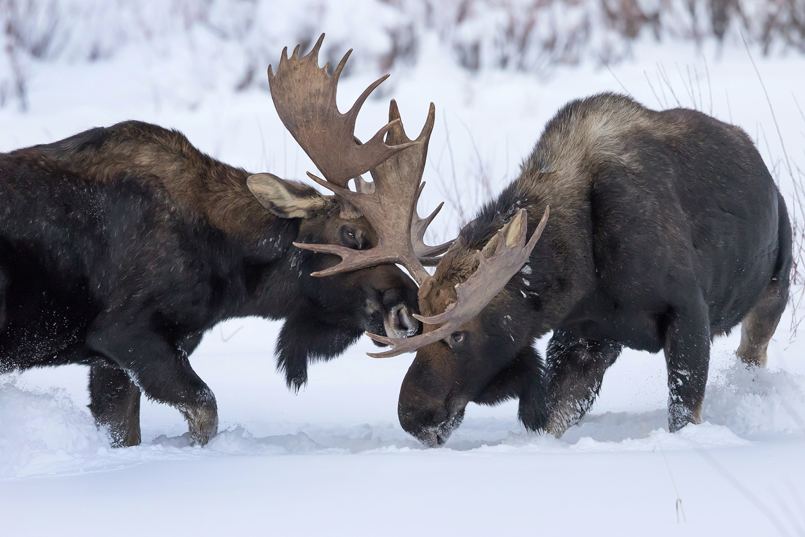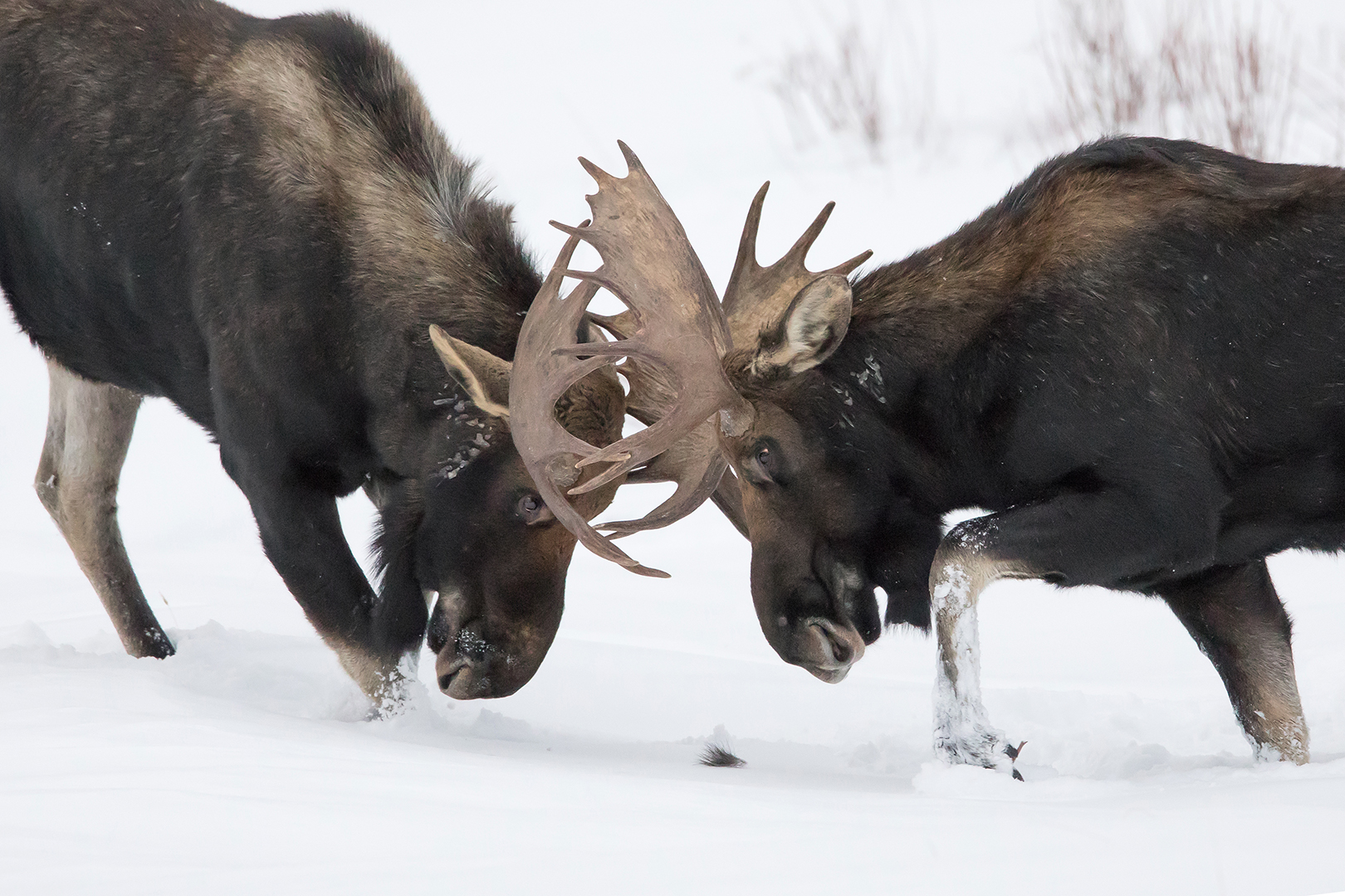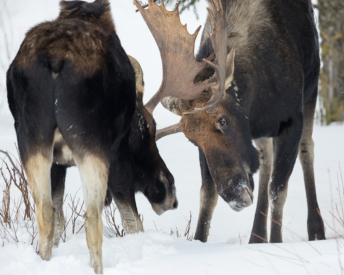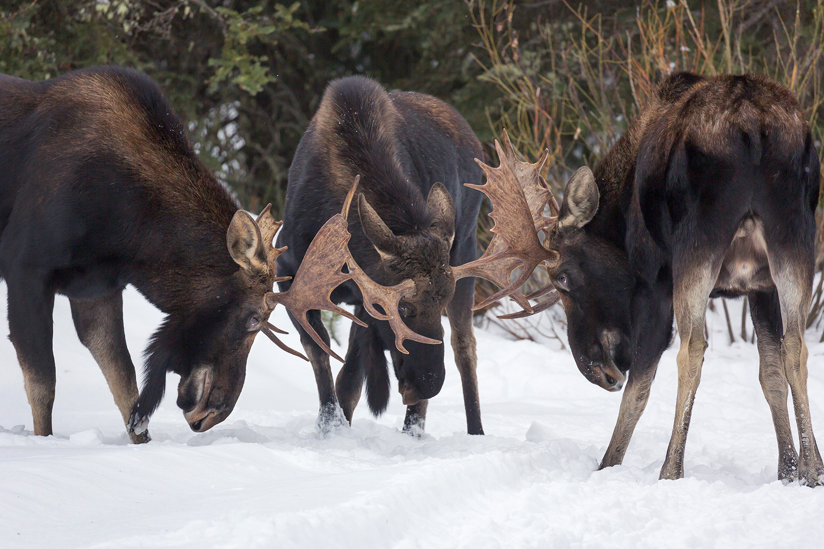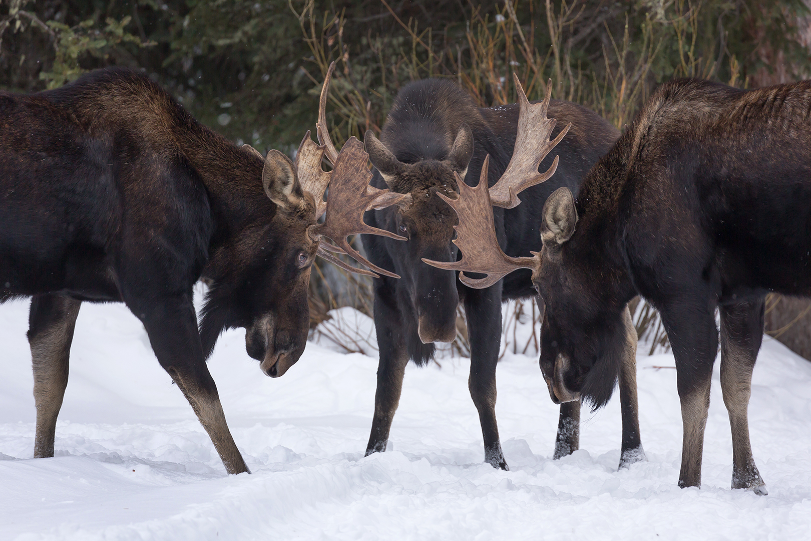 The amazing moose show hasn’t been confined to Yellowstone. A few days after seeing the four bull moose at Round Prairie I ran into a group of three different bull moose just across the creek from our home in Silver Gate. Marie and I and our neighbors Jill and Greg watched them graze and play-fight for over an hour. It was the first time I’d ever been able to photograph three bull moose locking antlers simultaneously. There’s something particularly distinctive and enjoyable about the sound of moose antlers click-clacking against each other.