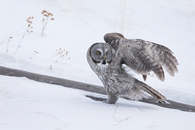 Jort explained that it’s extremely rare to see Great Gray Owls in an area like Silver Gate in the winter because the snow is so deep it’s difficult for them to hunt. He suspected that this owl was still too young to know better. And – based on its size and the shape of its tail feathers – he identified it as a male.