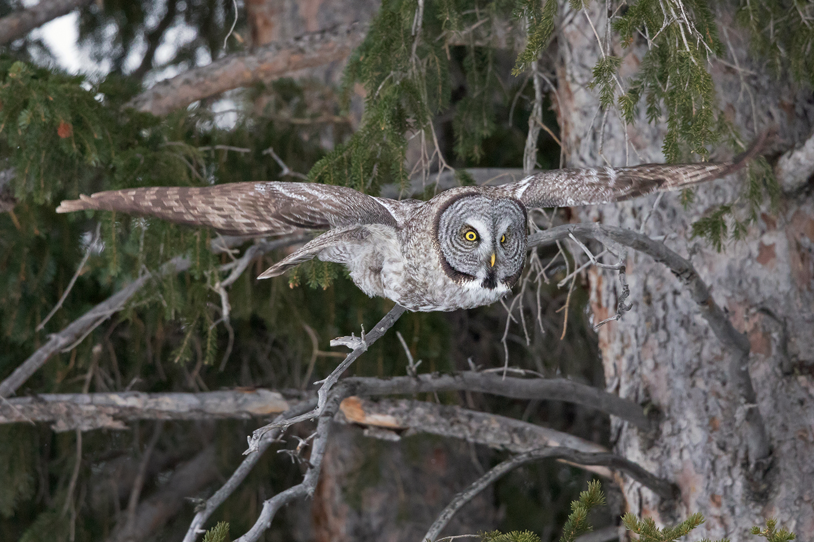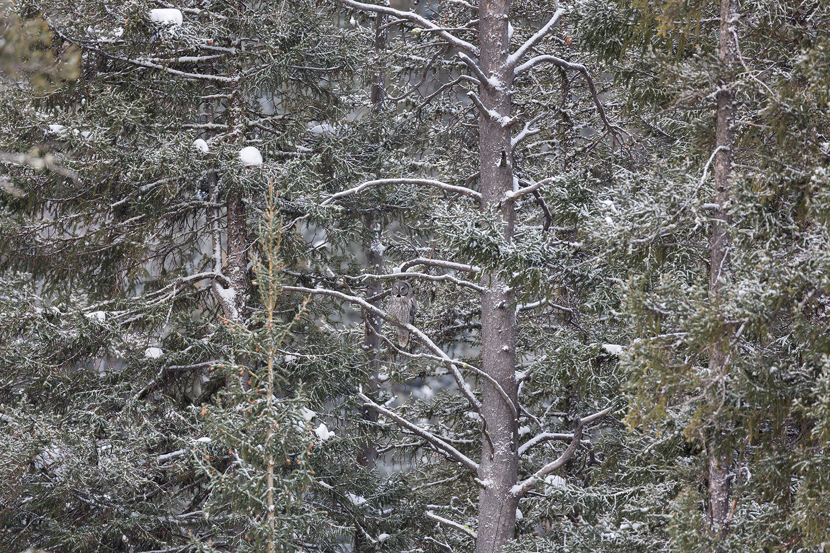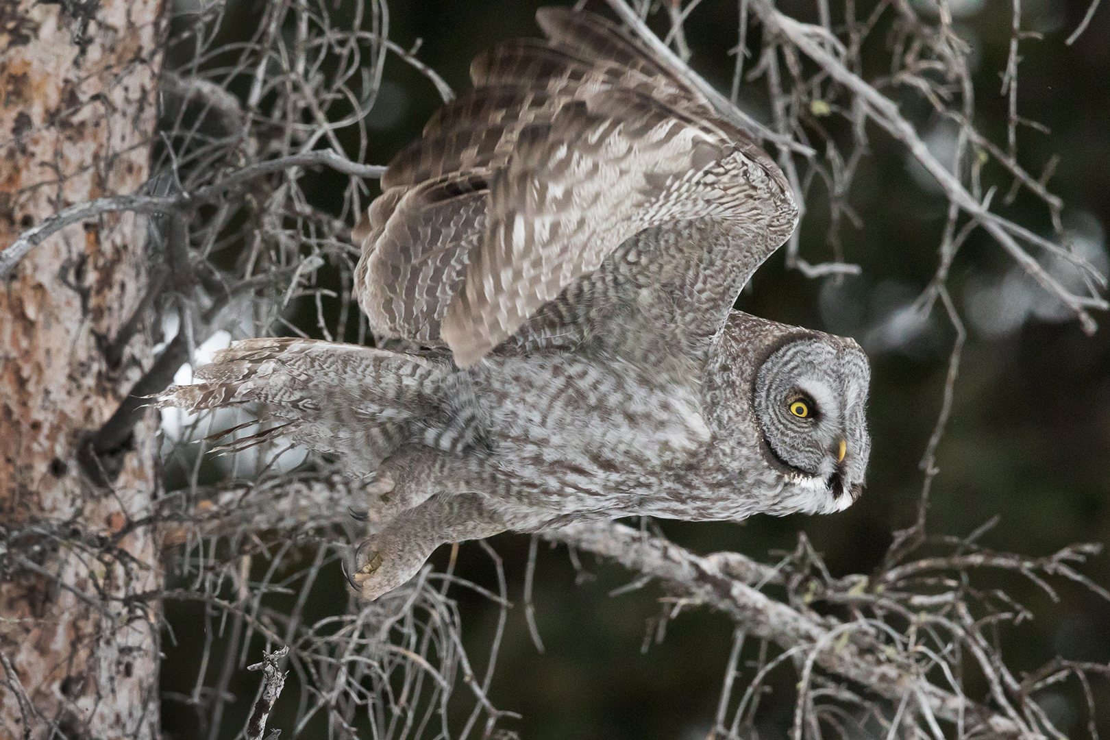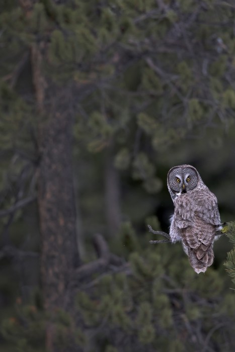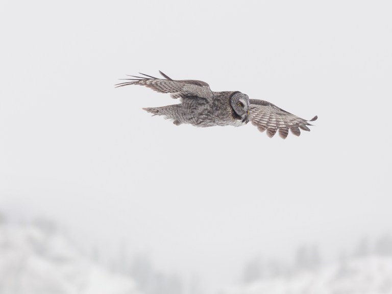 Jort, a photographer friend with a particular interest in owls, suggested that we may have not seen the last of the Great Gray. Apparently they often don’t move very far from day to day. So for the next several days we searched the meadow and surrounding area over and over, always coming up empty. Just when I was about to accept that the owl had moved on, it was spotted east of Silver Gate. We found it in a line of trees beside the road, hunting rodents on the slope of a hill where there was less snow.