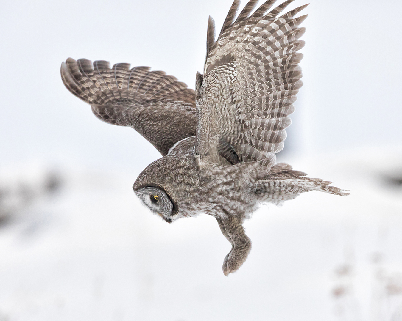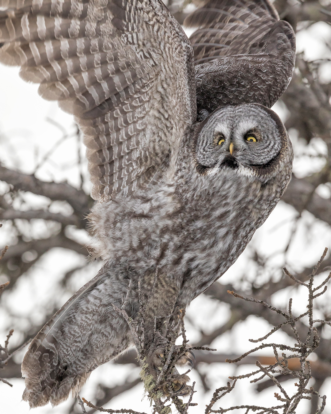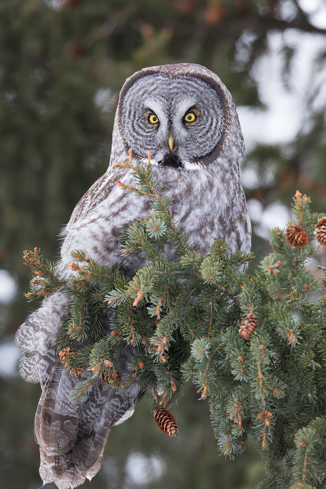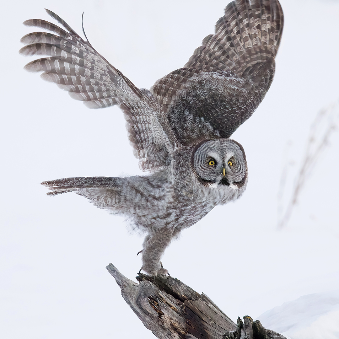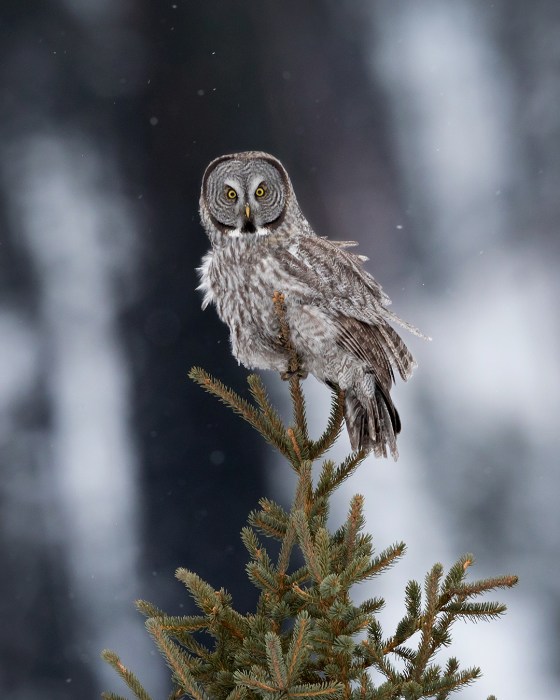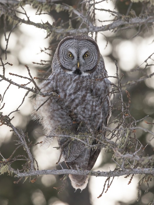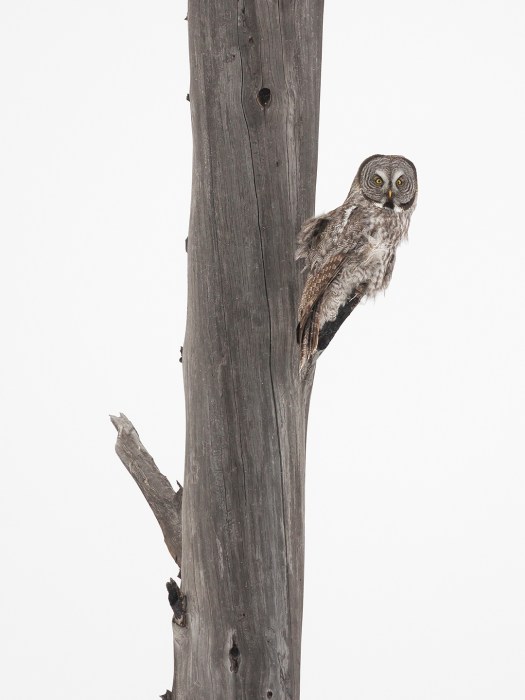 Great Gray Owls are such unique-looking birds. They’re big, of course, although much of their size comes from an unusually thick layer of gray and white feathers. Their head is basically a radar dish, a round concave surface that funnels even the faintest sounds to two hidden ears that are aligned asymmetrically in a way that helps the owl pinpoint the location of its prey with uncanny precision. Their eyes are intense yellow circles surrounding pitch black pupils, separated by two ridges of feathers that form a white “X” above their small yellow beak. And their legs – completely covered with feathers and capped with sharp talons – can stretch far enough to reach rodents hidden under two feet of snow.