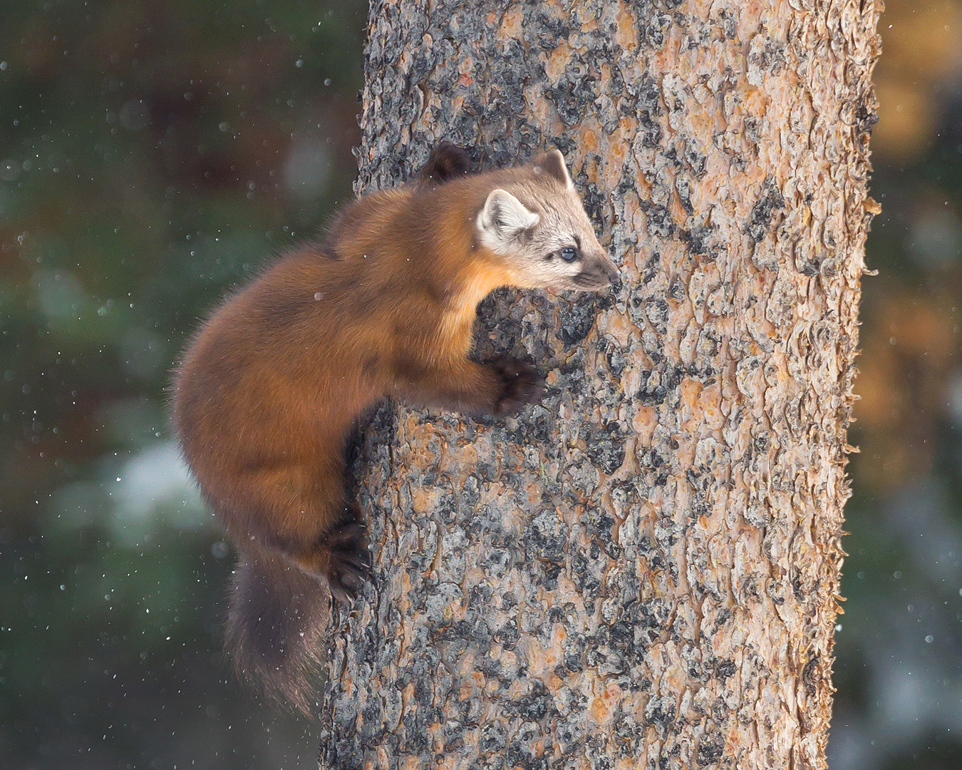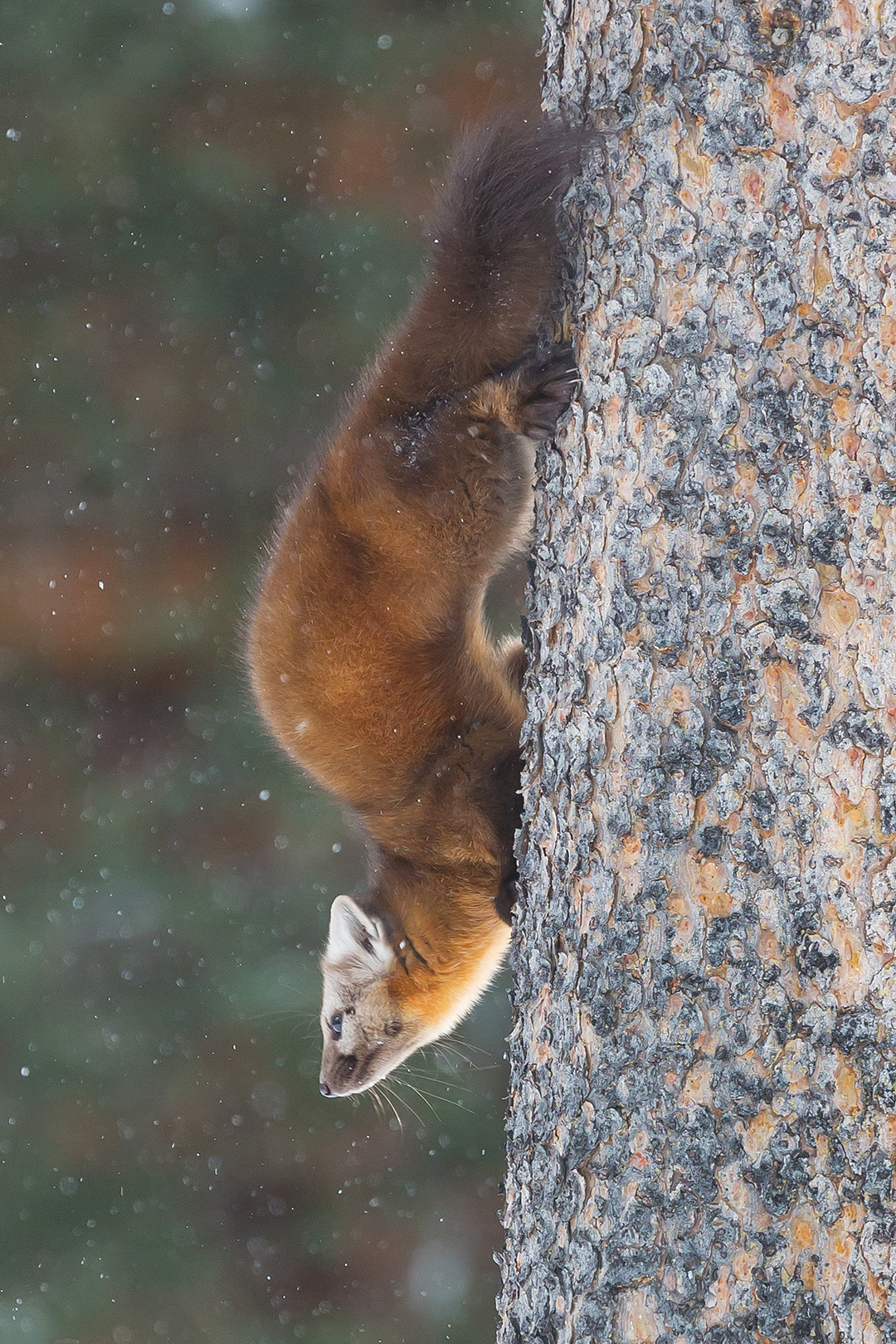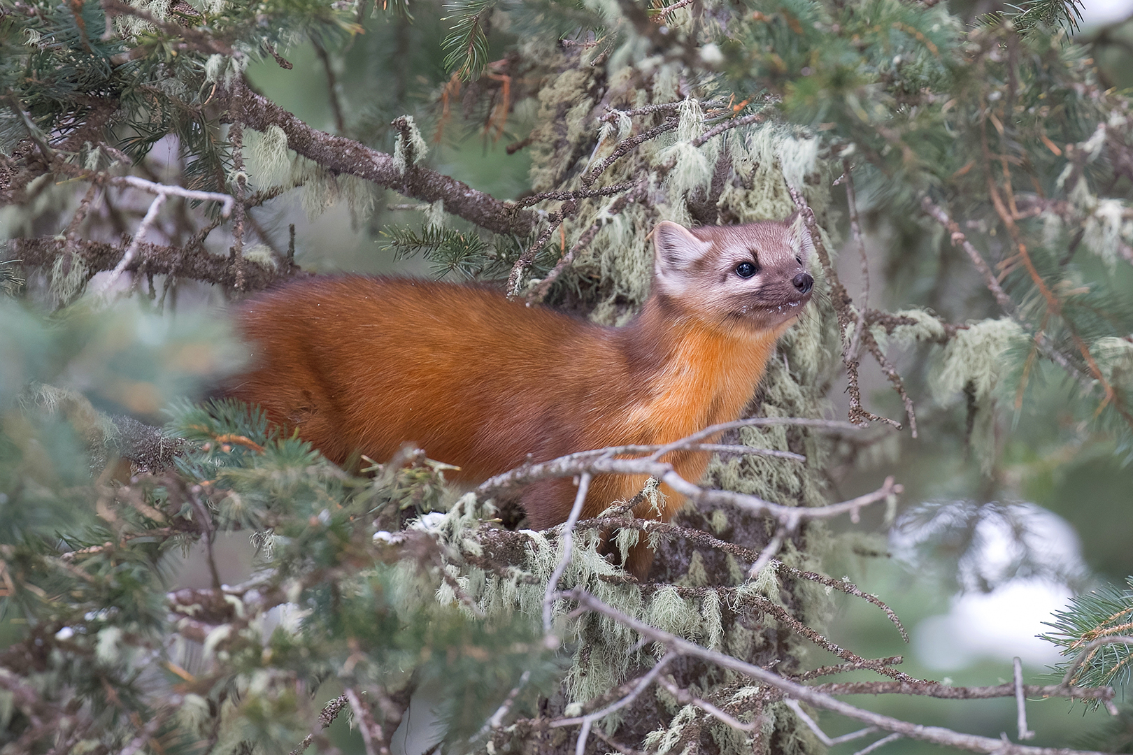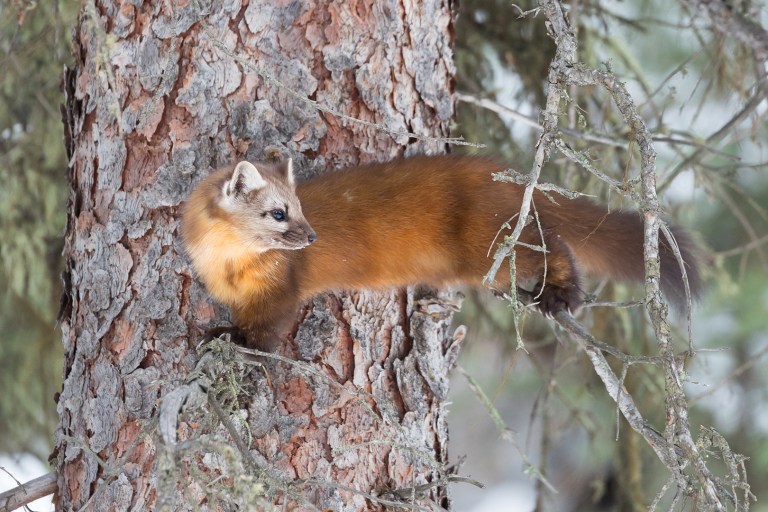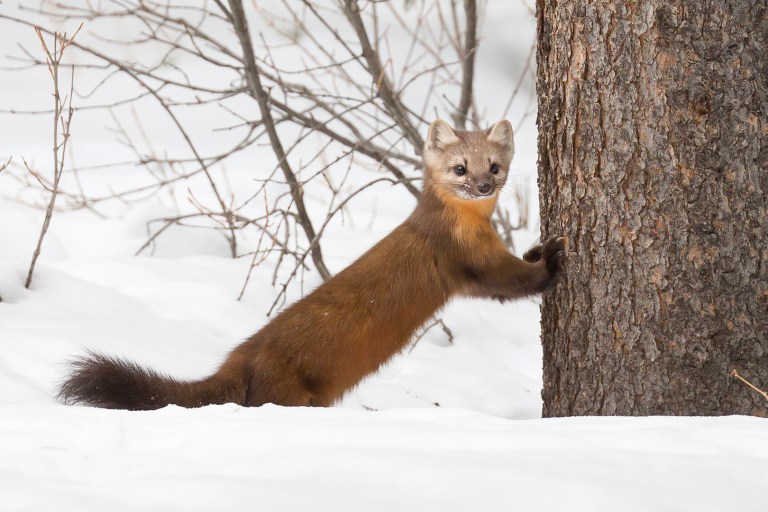One morning the owl appeared for its usual show before taking a break out of sight. I returned home for my own break, only to get a text from Jort that he’d found two pine martens nearby. Thrilled at the prospect of getting some marten photos, I raced over to meet Jort. One of the martens was already gone, but the other patiently let us tag along as it bounded from tree to tree. We had to slog through deep snow again, but Jort, Nick and I were able to spend more than an hour with our new friend.
