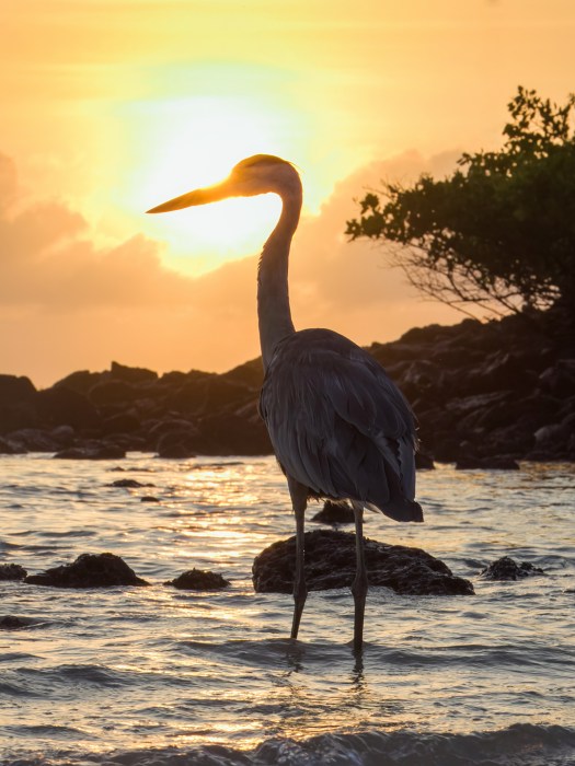For this trip Marie and I wanted to spend several weeks in one spot, and I couldn’t have been happier that we did. Each visit to Tortuga Bay was a fun experience by itself, but becoming familiar with the place over time was genuinely special. Going there so often revealed details and rhythms I never would have noticed otherwise. The Great Blue Heron I saw on my first visit turned out to have a mate, and sometimes they’d fly to a nest made of twigs in a nearby mangrove tree. One particular marine iguana always began its morning soaking up the sun, but after a while it would shuffle over to a specific location by a bench in the shade, even if it had to scramble over my foot to get there. Several pelicans were nesting in a mangrove tree by a big tidepool at the end of Playa Brava, and on most mornings they would return to the tree to feed their four snow-white babies (which began to turn from white to gray as the days went on). In the calm early-morning surf at Playa Mansa I almost always found baby blacktip and hammerhead sharks – sometimes more than 30 of them – and once a large Galapagos shark appeared along the edge of a wave.