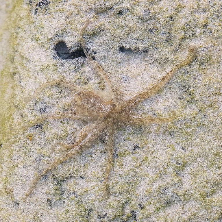 The octopus appeared to be stranded in the sand, and with the tide receding it wouldn’t be long before a bird turned my new friend into a meal. But in trying to help would I do more harm than good? I pushed my index finger into the sand underneath the octopus, raised it up, and carried the little guy over to the surf. Initially the octopus refused to let go. Its tiny suction cups clung to my finger, forcing me to very gently brush it loose. I hoped the octopus would swim away in the water, but within a minute it washed back up on the sand. I picked it up again and decided to take it to a large tidepool that had a channel to the ocean. I set the octopus down in the water on top of a medium-sized rock, and almost immediately it seemed to come to life. Its coloring shifted slightly to better match the new environment, and all eight limbs sprung into action as the octopus worked its way down the side of the rock and vanished underneath. I have no idea if I helped or not, but I hope I at least improved its odds of surviving a little longer.