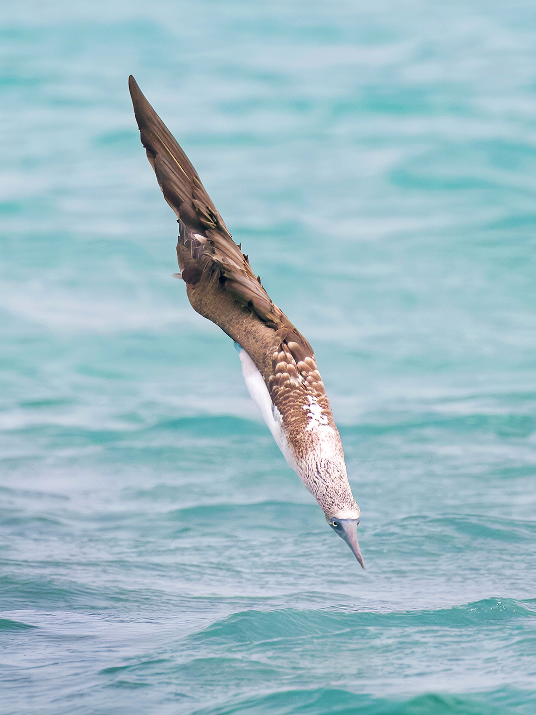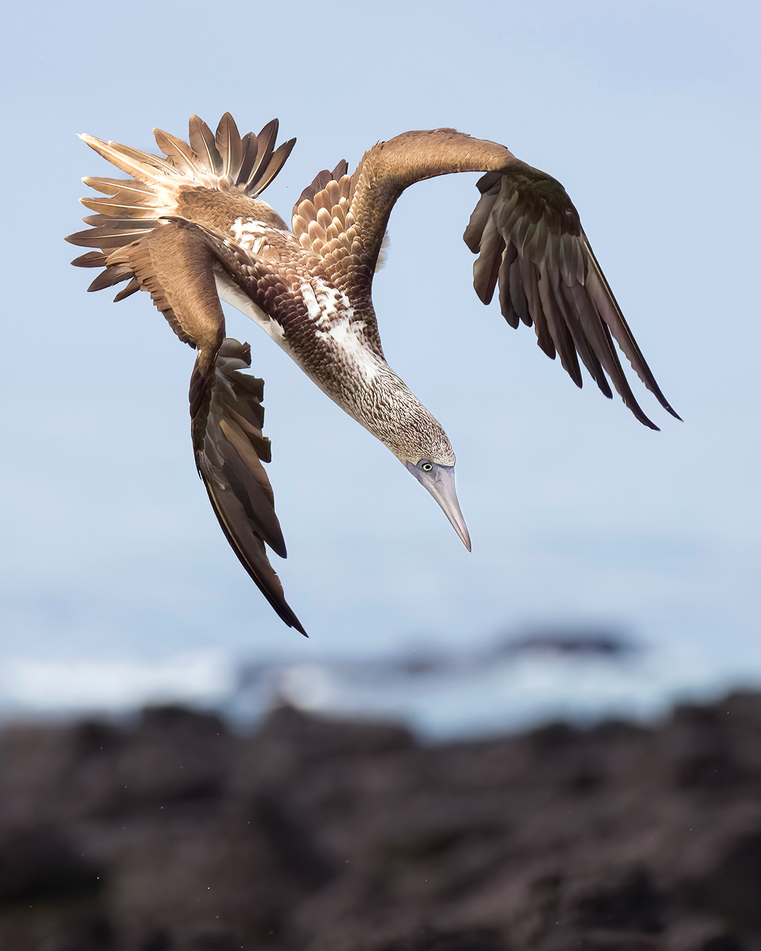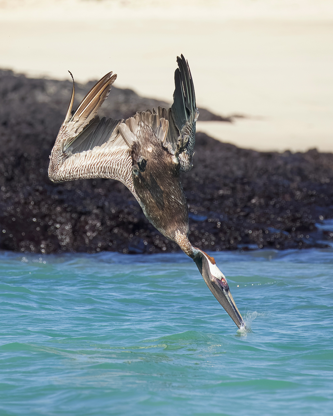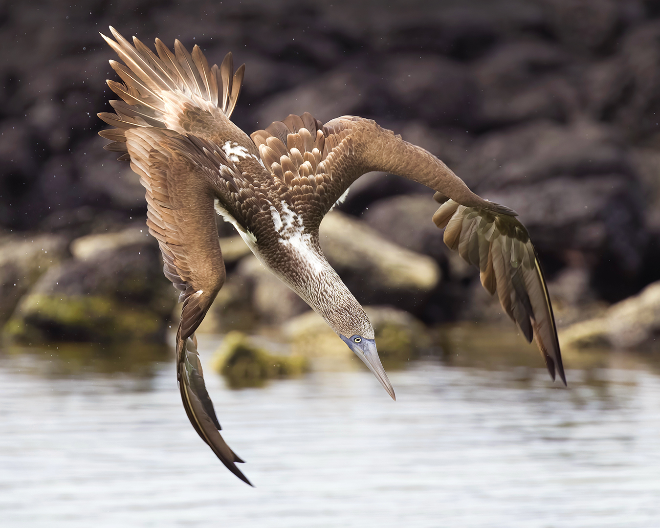 Back in December I had a chance to photograph a Great Gray Owl near our home in Silver Gate, and I was mostly disappointed with my shots. In particular I thought I did a poor job of capturing the owl in flight. So I resolved to do better, and the birds in the Galapagos gave me every opportunity. I spent many hours photographing Blue-footed Boobies diving into the water for fish, trying my best to catch their aerial acrobatics and the way they streamline their bodies before knifing into the water.