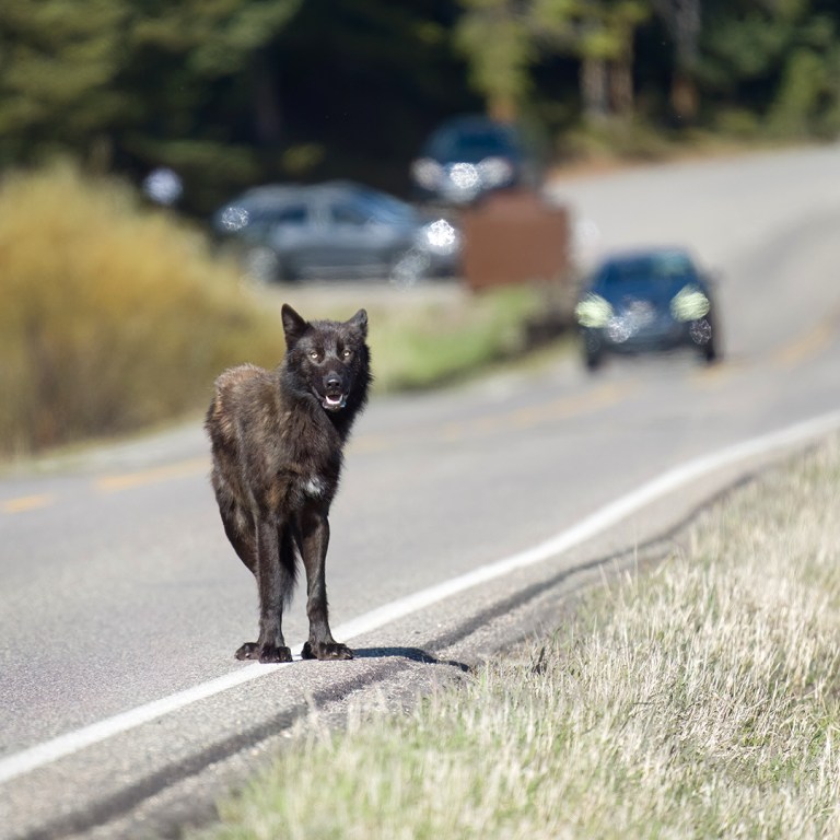 Black Wolf Crossing the Road on a Sunny Morning in Yellowstone