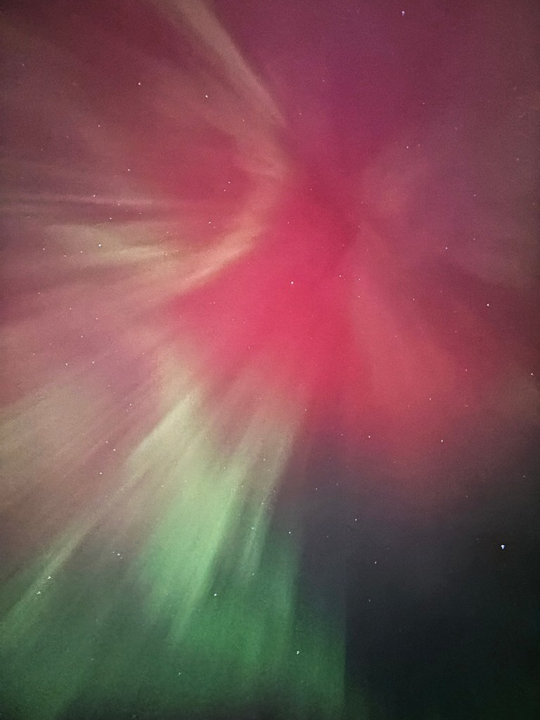 We read later that it was the strongest geomagnetic storm in over two decades.  Photos and videos do a poor job of conveying the experience.  Marie’s handheld cell phone captured it about as well as my big camera on a tripod.