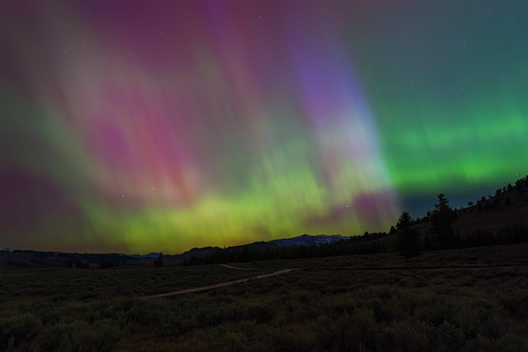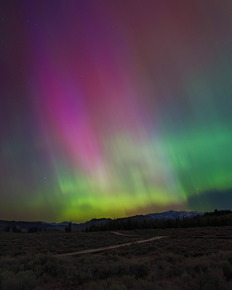 Around midnight the colors began to fade.  We assumed the show was winding down and decided to start driving back home.  As we neared the Blacktail Plateau, however, it became clear that what we’d seen at Mammoth was just a warm-up.  Shimmering curtains of green, yellow, and purple-pink filled the sky.  We stopped at a pullout and gaped with wonder.  Looking straight up, it seemed as if Yellowstone had been covered in some kind of translucent dome that was projecting wave after wave of pulsing, swirling, multicolored radiance.