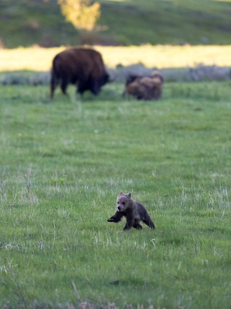Separated Grizzly Cub Spooked by Bison