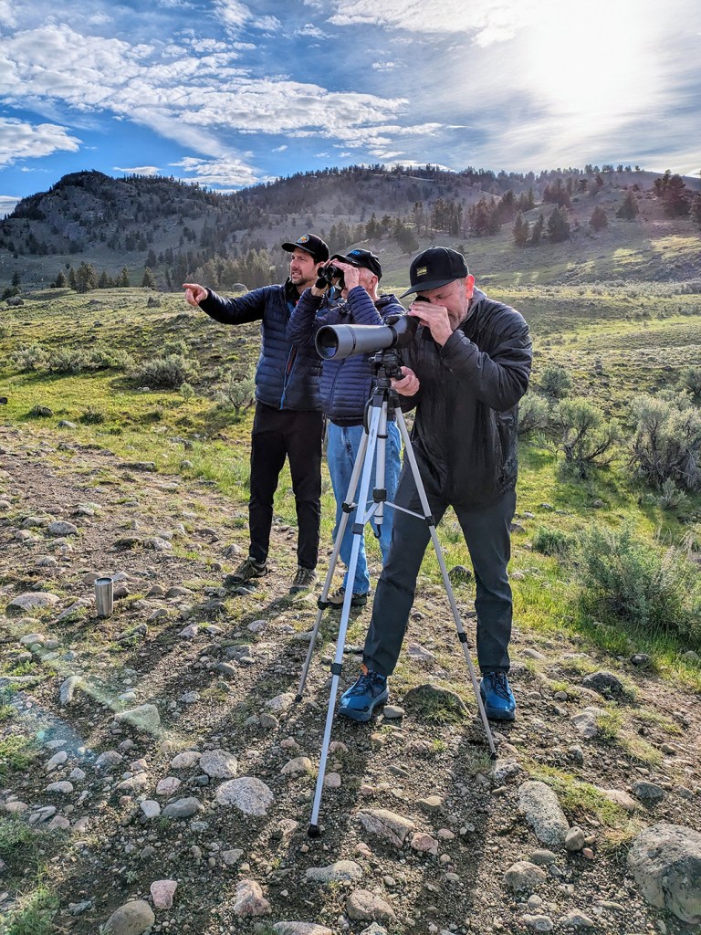 Our guests the next weekend were my longtime friend Rob E., his brother Todd, and their dad Jeff.  It’s always great to see Rob, and I really enjoyed getting to know Todd and Jeff.  Before their visit they’d read American Wolf, so setting up our spotting scope by Rick McIntyre (who features prominently in that book) and seeing the Junction Butte pack next to a wolf-watching legend was a highlight.