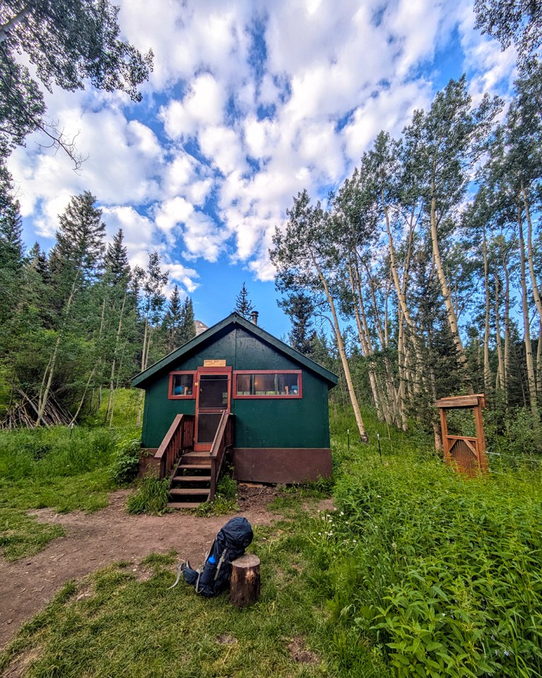 We shouldered our packs at the Alder Creek trailhead and started hiking.  The miles passed smoothly as we walked through aspen groves that occasionally opened up to reveal views of the jagged peaks of the San Juan mountains.  The weather was perfect that day and for our entire hike – cool in the mornings and evenings, pleasantly sunny and warm during the days.  After only a few hours we arrived at the first hut, 10,610 feet above sea level.