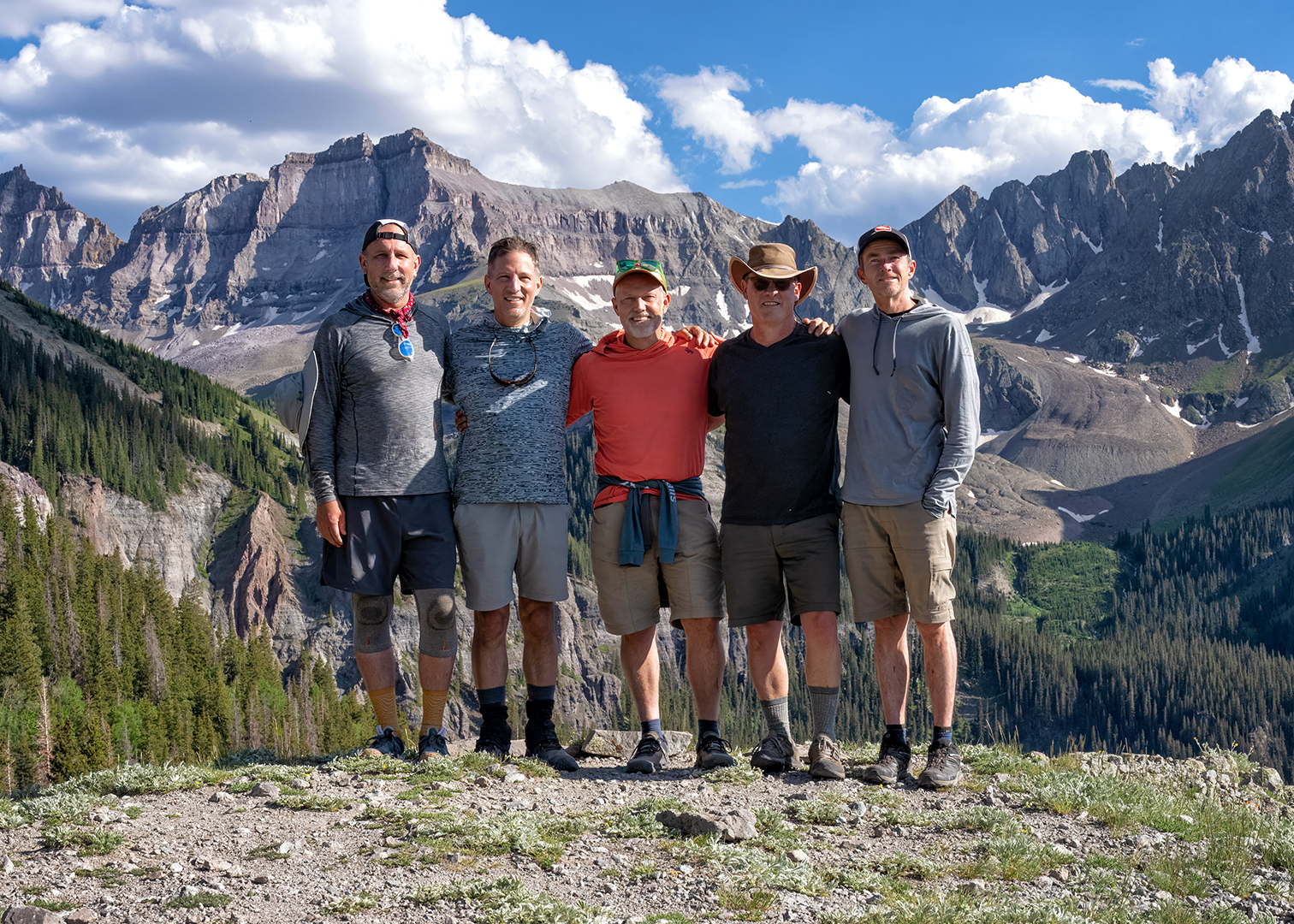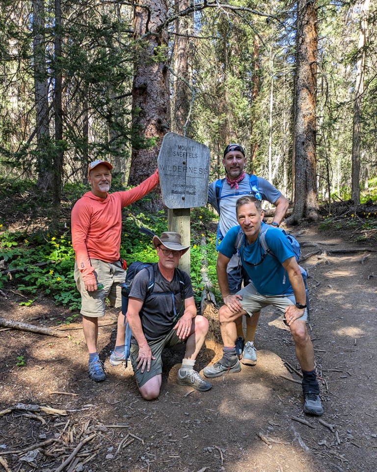 This was our group’s fourth annual hiking trip.  In 2021 we explored southern Utah, in 2022 we went to Yosemite, and in 2023 we hiked the Lost Coast.  Work commitments prevented Gordon from making those first three trips, and it was awesome that he was able to join this year.  Kevin and David came up with the idea of tackling the Sneffels Traverse, a five-day, 30-mile, hut-to-hut hike in southwestern Colorado that basically runs from Telluride to Ouray.  Each of the simple one-room huts had eight bunks with foam mats, sleeping bags, and a propane stove, which significantly reduced the amount of gear we needed to carry.  The distance between huts was never much more than eight miles, but the near-constant elevation changes added an extra level of difficulty.  The trail was usually either going up or down, often steeply.