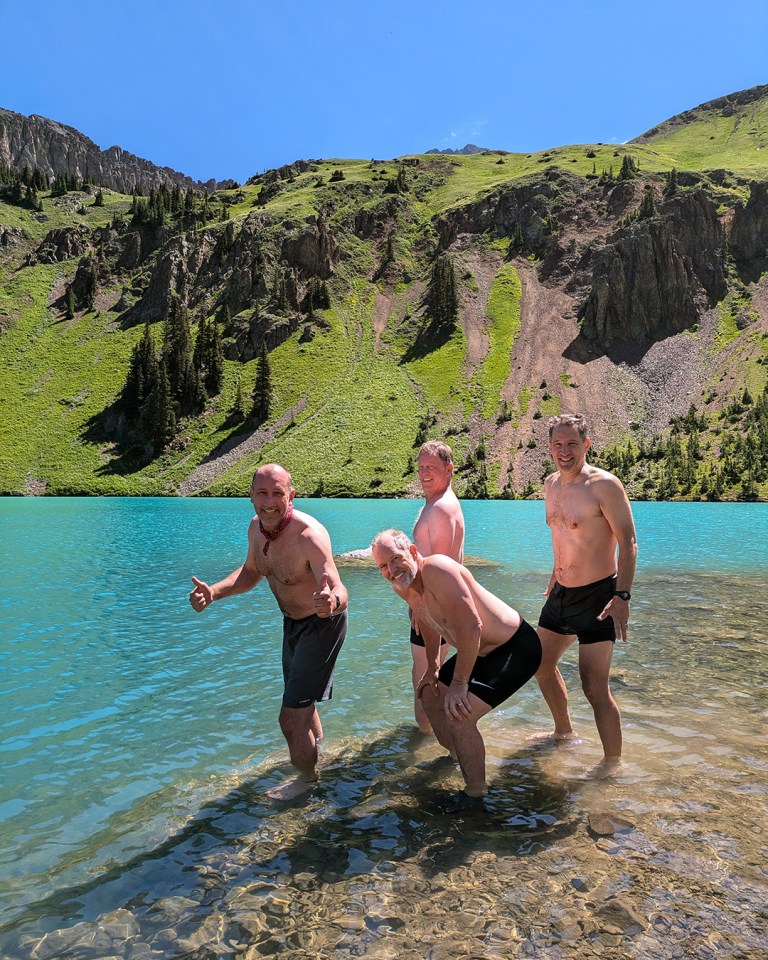 By the time we finished dinner Mark and Sue were long asleep, adhering to an extreme “early to bed and early to rise” routine that had them packing up (loudly) and hitting the trail at 5am each morning, the sky still so dark that they had to use headlamps.  We leisurely enjoyed our morning coffee (thanks again Kevin!) and started our third day on the trail with a nine mile roundtrip side hike to lower Blue Lake, where everyone except me bravely polar-plunged into the icy, aquamarine water.