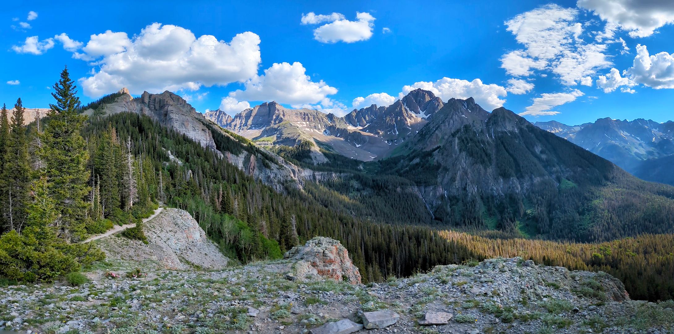 But – during that interminable climb to the Wilson Creek Summit – we were so exhausted that for once we mostly trudged forward in silence.  It was a welcome relief when we finally reached the summit, just a short walk away from the Sneffels overlook, which we’d heard described as one of the most beautiful spots in all of Colorado.  The view lived up to the hype.  We’d arrived at a high point of our trip, literally and figuratively.