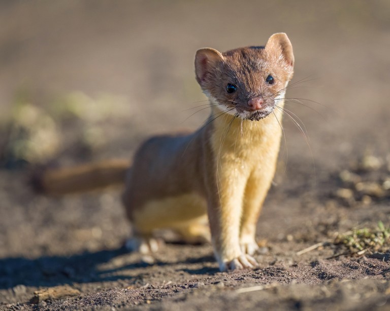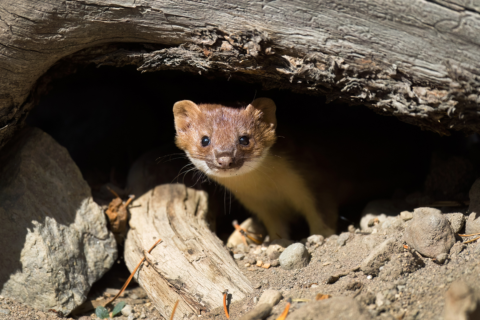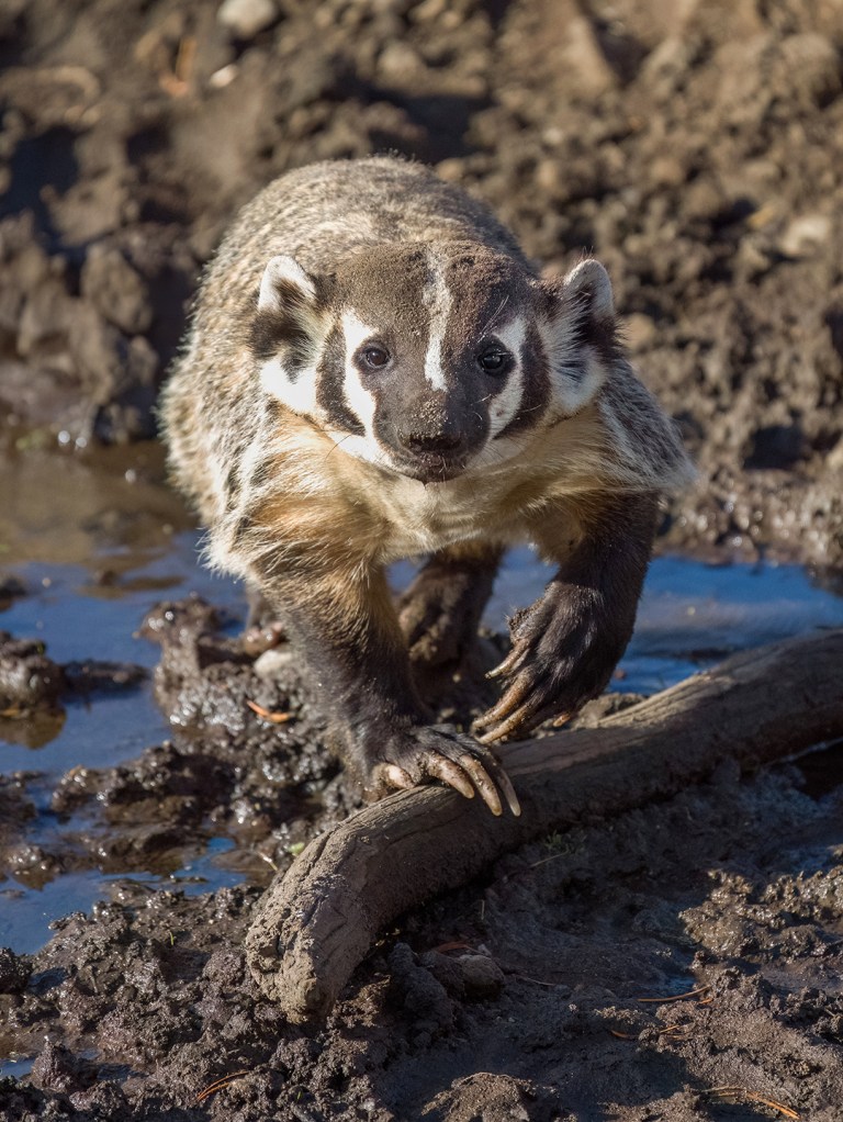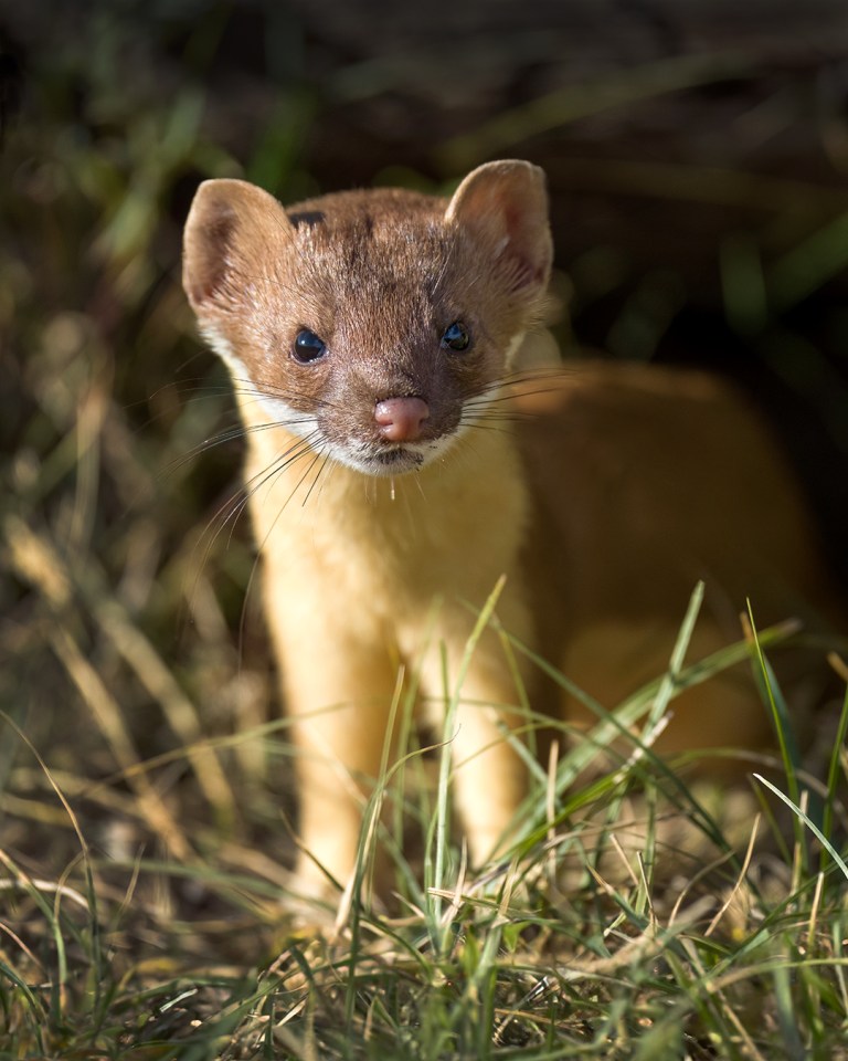 I had no luck the following morning, but after that I found the weasel (and often a badger, too) every day for over a week. At some point I began to suspect there might be at least two different weasels – one with a brownish nose and more rounded eyes and one with a pinker nose and sharper facial features. Then one morning I was photographing the weasel when a second weasel darted right past me. Mystery solved – it was a family! Later I began seeing a weasel with a few white hairs in the middle of its face, bringing the count up to at least three.