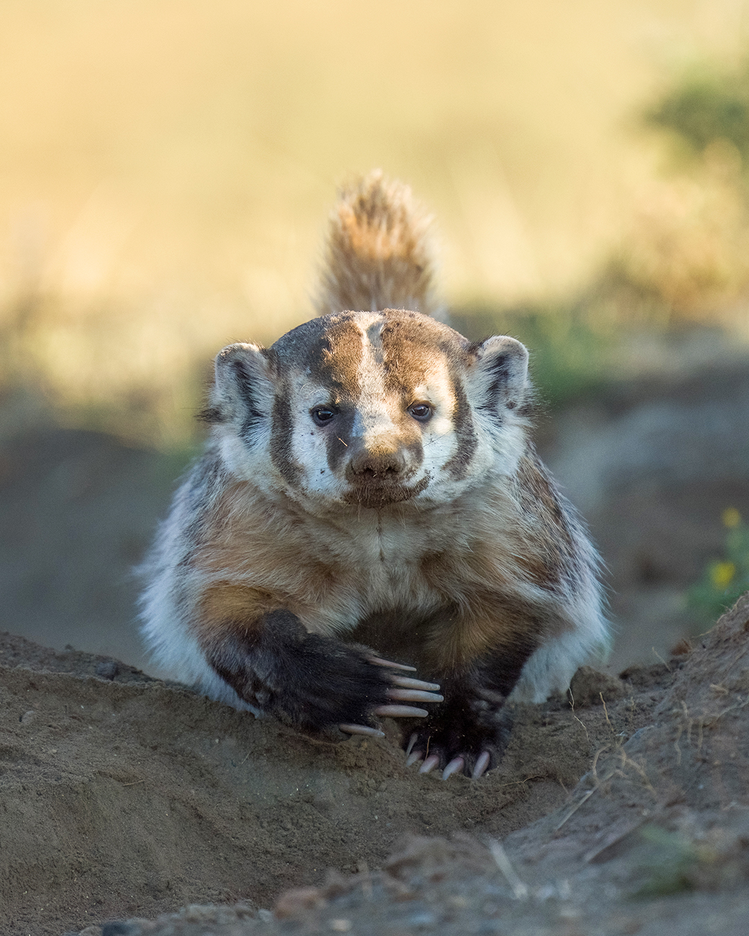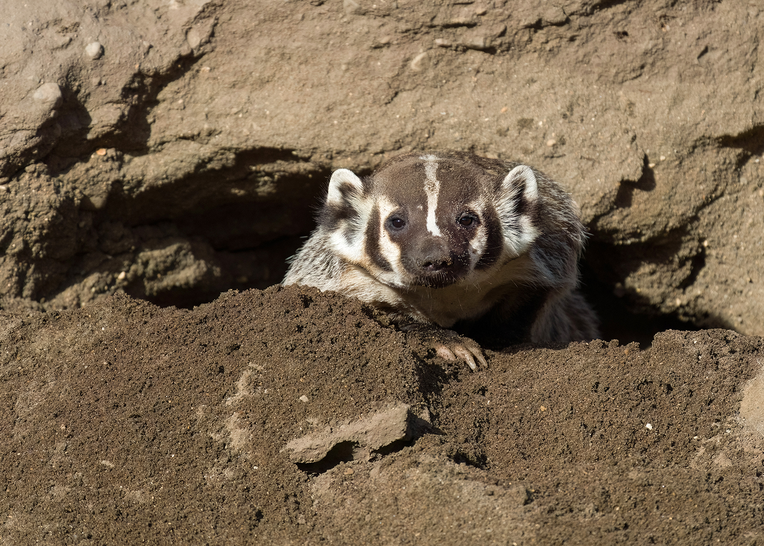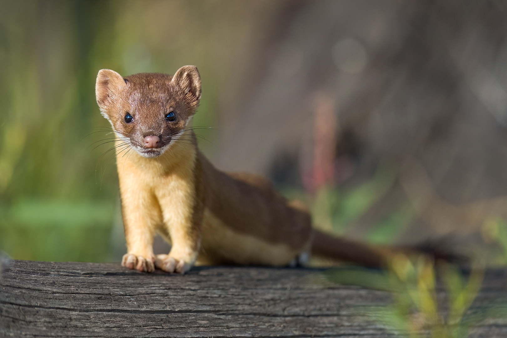 I had no luck the following morning, but after that I found the weasel (and often a badger, too) every day for over a week. At some point I began to suspect there might be at least two different weasels – one with a brownish nose and more rounded eyes and one with a pinker nose and sharper facial features. Then one morning I was photographing the weasel when a second weasel darted right past me. Mystery solved – it was a family! Later I began seeing a weasel with a few white hairs in the middle of its face, bringing the count up to at least three.