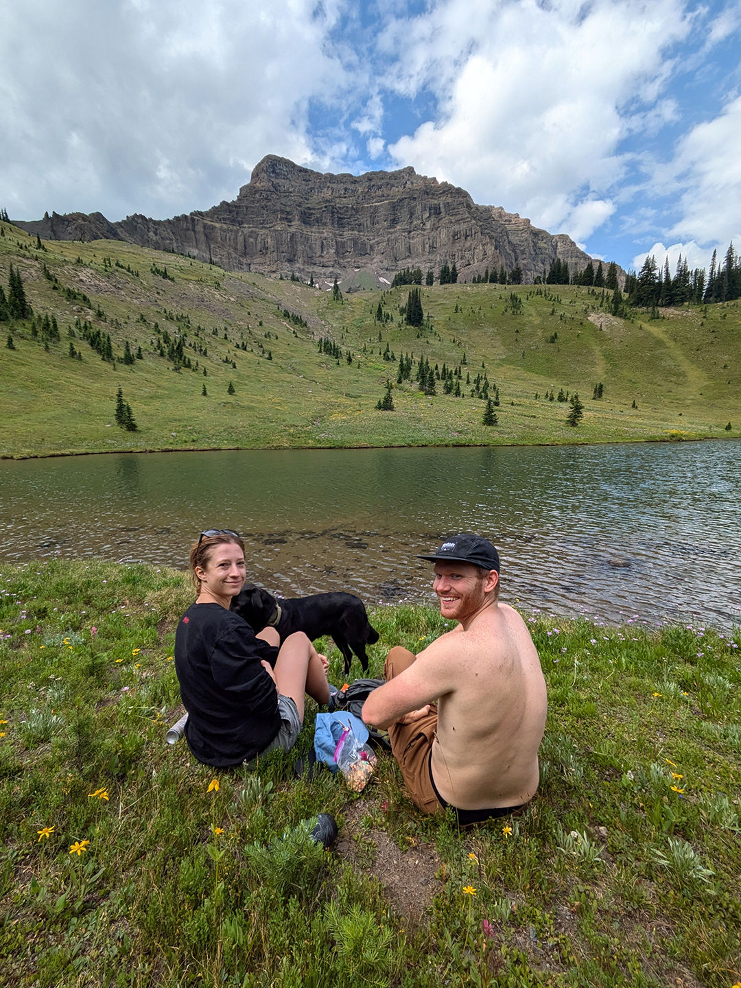 For my next two hikes I had company. My niece Kate had been wanting to check out Guitar Lake, and in early August we hiked up there with her boyfriend Ian and their dogs. Guitar Lake is on National Forest land just underneath the peak of Amphitheater Mountain, and – while most of the trail is well-marked – it eventually gets a little sketchy. Marie and I went there once a couple of years back and found the hike to be challenging and stressful, partly because of the elevation gain, partly because of the vanishing trail, and partly because at one point there’s a steep scramble up a rocky, exposed cliffside with 100-foot dropoffs. But everyone made it there safely, including the dogs, and this time we found a viewpoint just north of the lake that let us look back on Silver Gate.