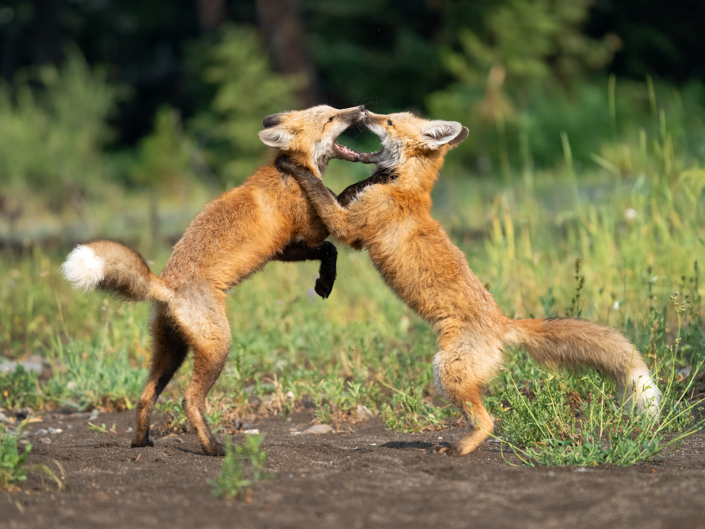 I wasn’t so focused on hiking and weasels that I forget about Smudge and Daisy, the fox kits I spent a lot of time watching in late spring and early summer. Towards the end of July I found them together by their den, happy and healthy and joyfully harassing each other.