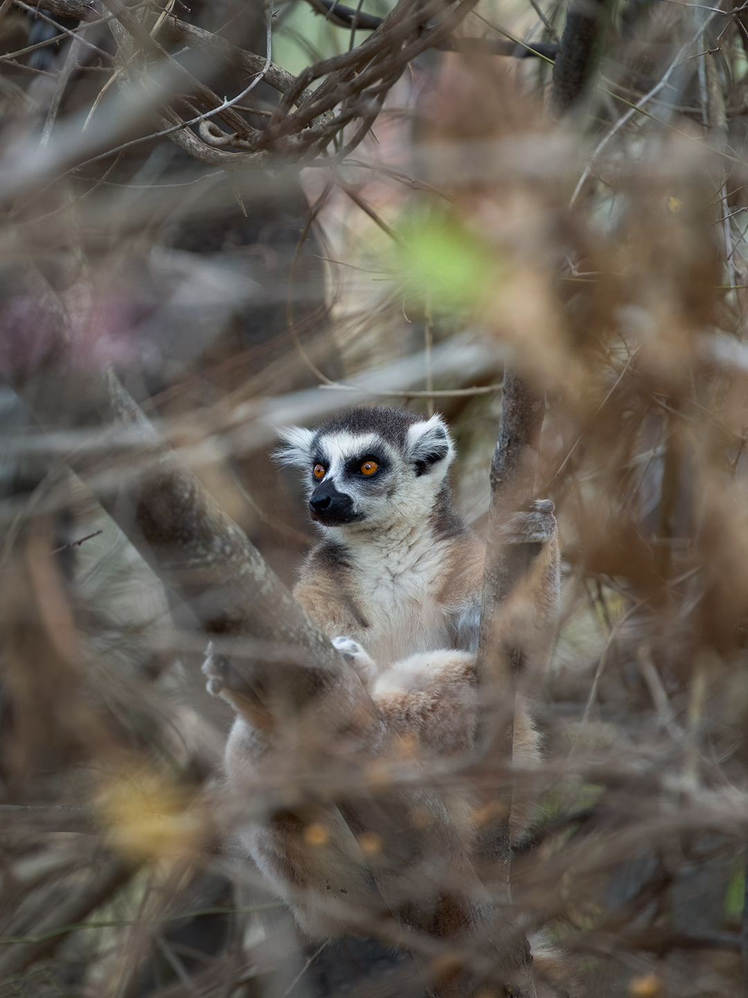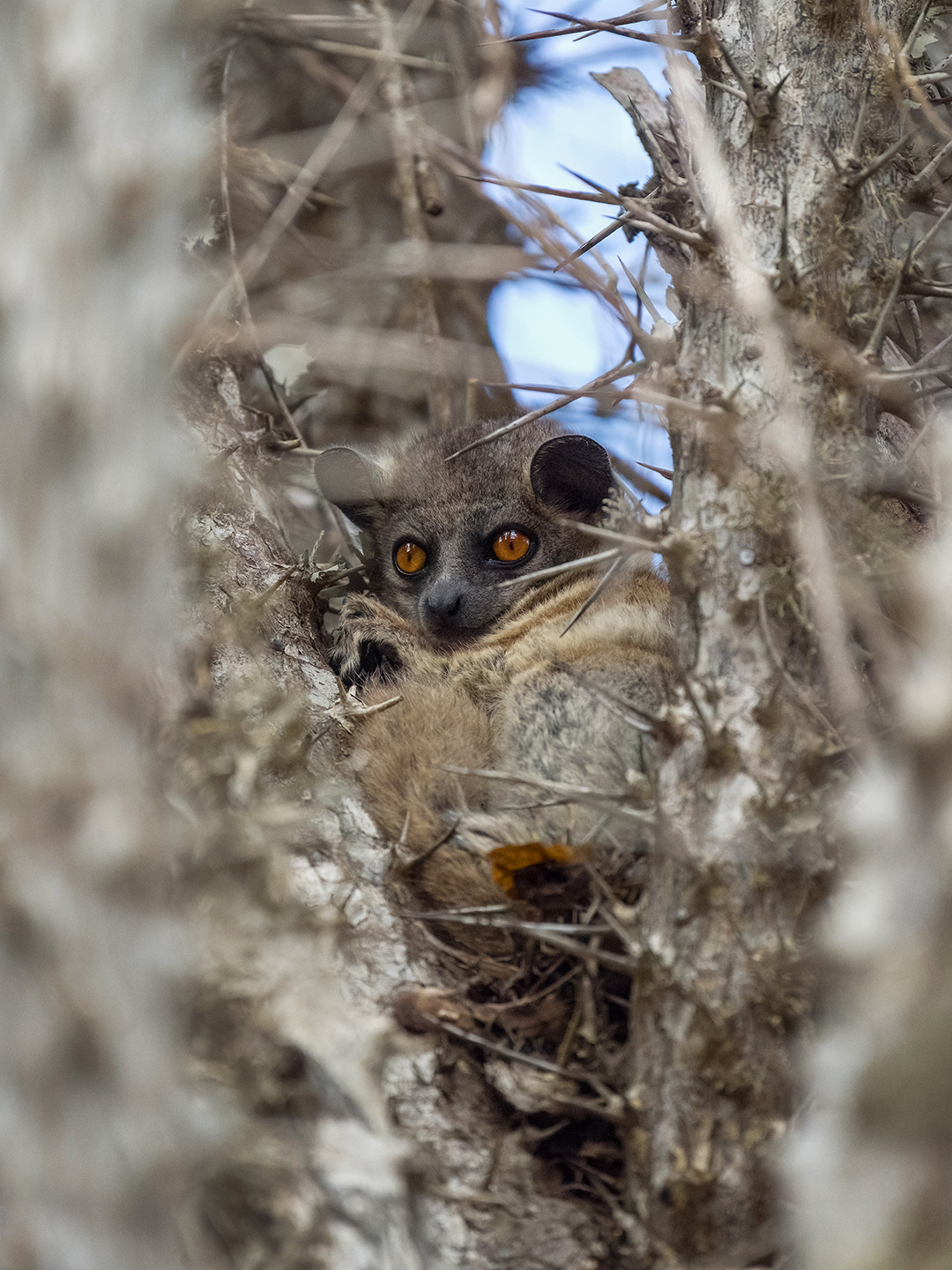 Kat and I were so excited about the prospect of seeing our first wild lemur that even a slim chance was irresistible – we headed right back to the forest that afternoon (Marie was almost intrigued enough to join but chose beach time instead).  Very quickly our guide led us to a tree-sized cactus and pointed to a small brown shape nestled in a thorny crevice.  A lemur!  The guide identified it as a white-footed sportive lemur, but when we researched it later we thought it might have been a Petter’s sportive lemur.  Regardless, what an amazing way to see our first lemur of the trip.  I hadn’t known there were any lemurs in the area at all, and had it not been for Kat we would have completely missed it.