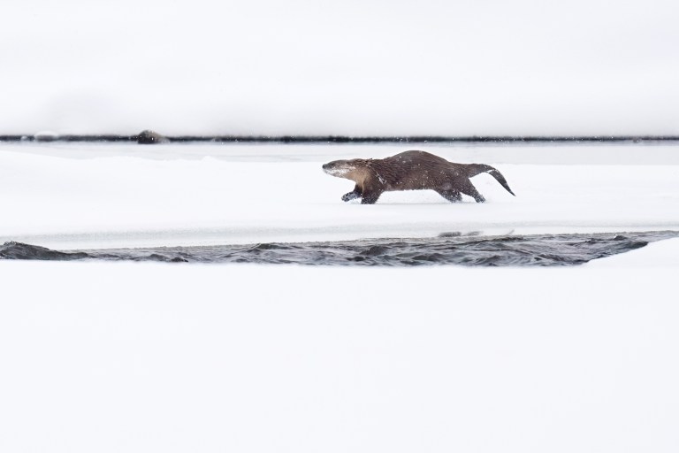 In early January I was driving through Lamar Valley when I noticed some people pointing cameras towards the Lamar River. Off in the distance I caught a glimpse of small dark shapes slicing through the icy water – three otters, the first I’d seen in Yellowstone in almost a year. I stopped at the nearest pullout and practically jogged through the knee-deep snow for a closer look.