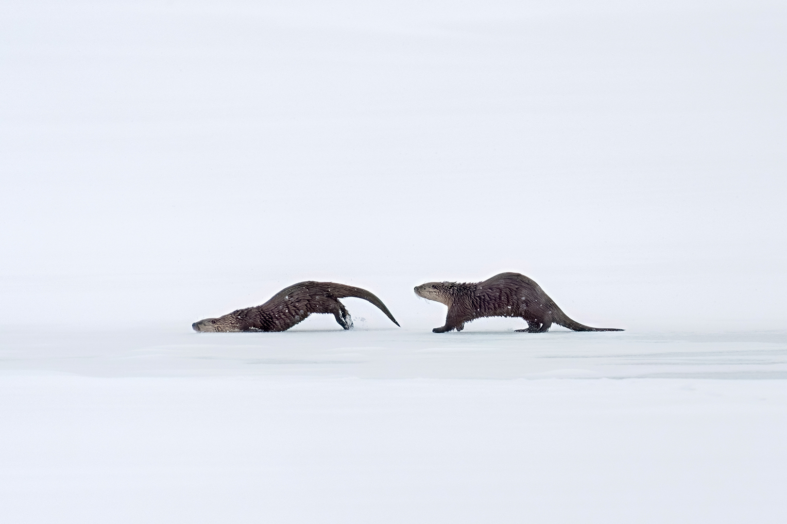 In early January I was driving through Lamar Valley when I noticed some people pointing cameras towards the Lamar River. Off in the distance I caught a glimpse of small dark shapes slicing through the icy water – three otters, the first I’d seen in Yellowstone in almost a year. I stopped at the nearest pullout and practically jogged through the knee-deep snow for a closer look.