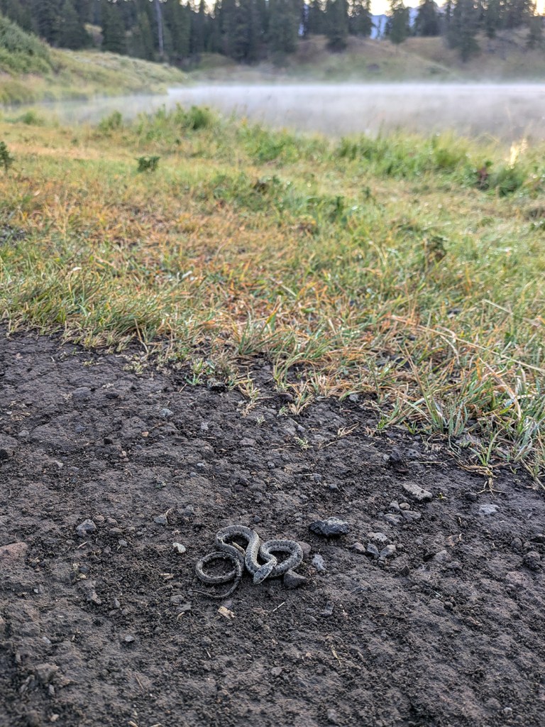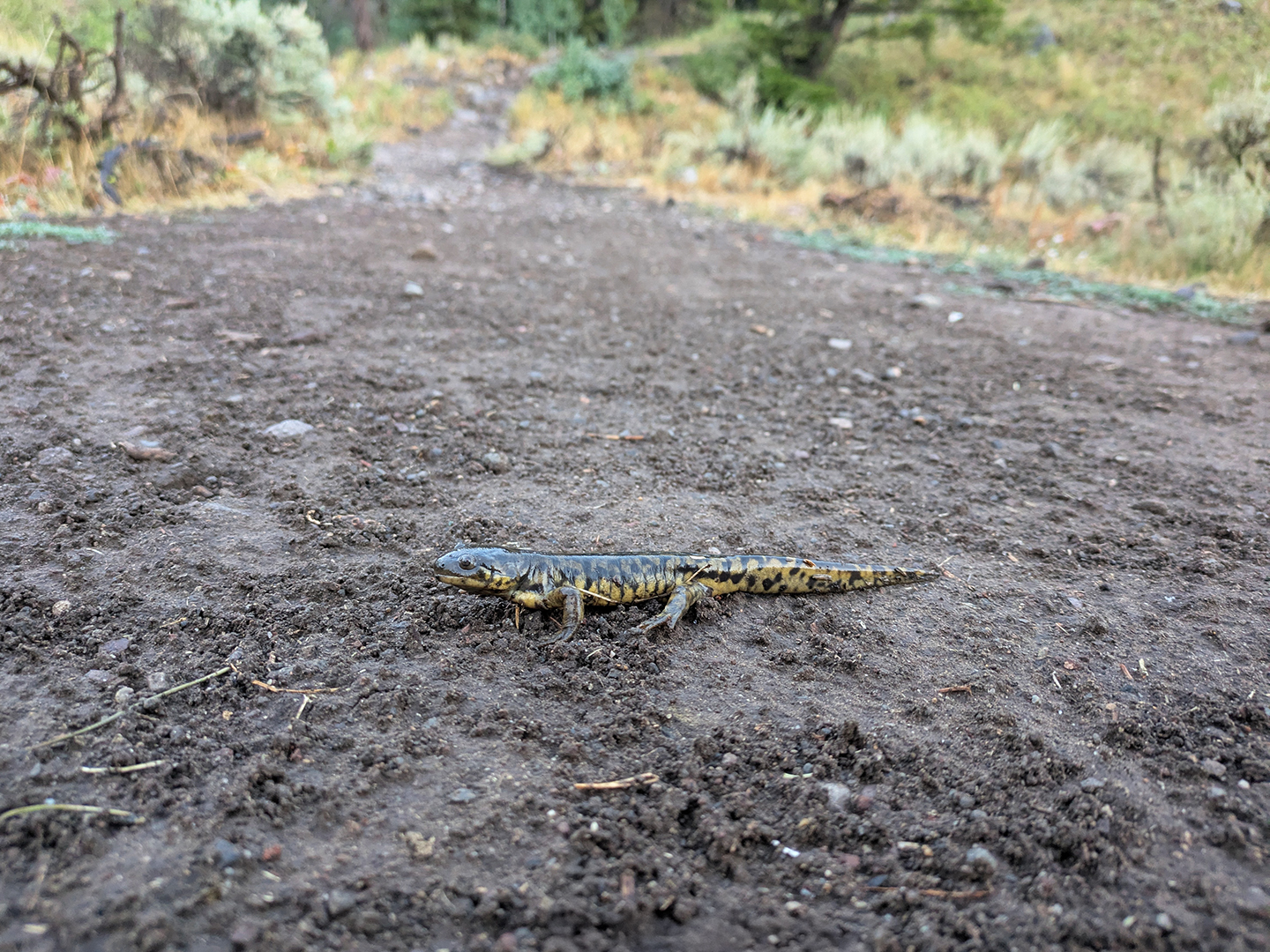 During the second half of August I found otters and badgers less often, but I did have a close encounter with a grizzly on the Lamar River Trail, plus some unusual reptile and amphibian sightings. One morning there was a western tiger salamander right in the middle of the trail up to Trout Lake, and another morning by the edge of the lake I found a small garter snake that seemed half-frozen.
