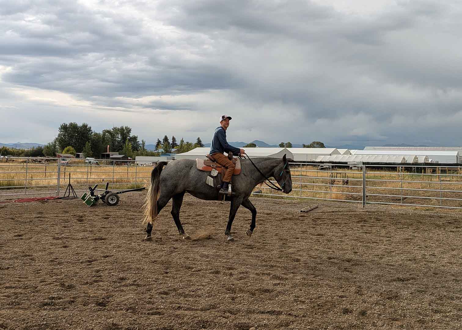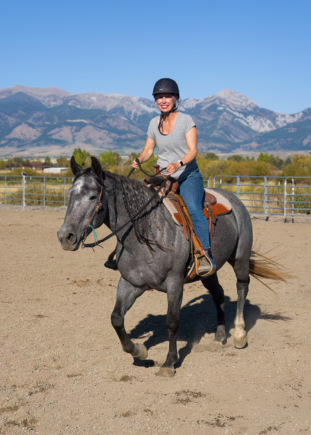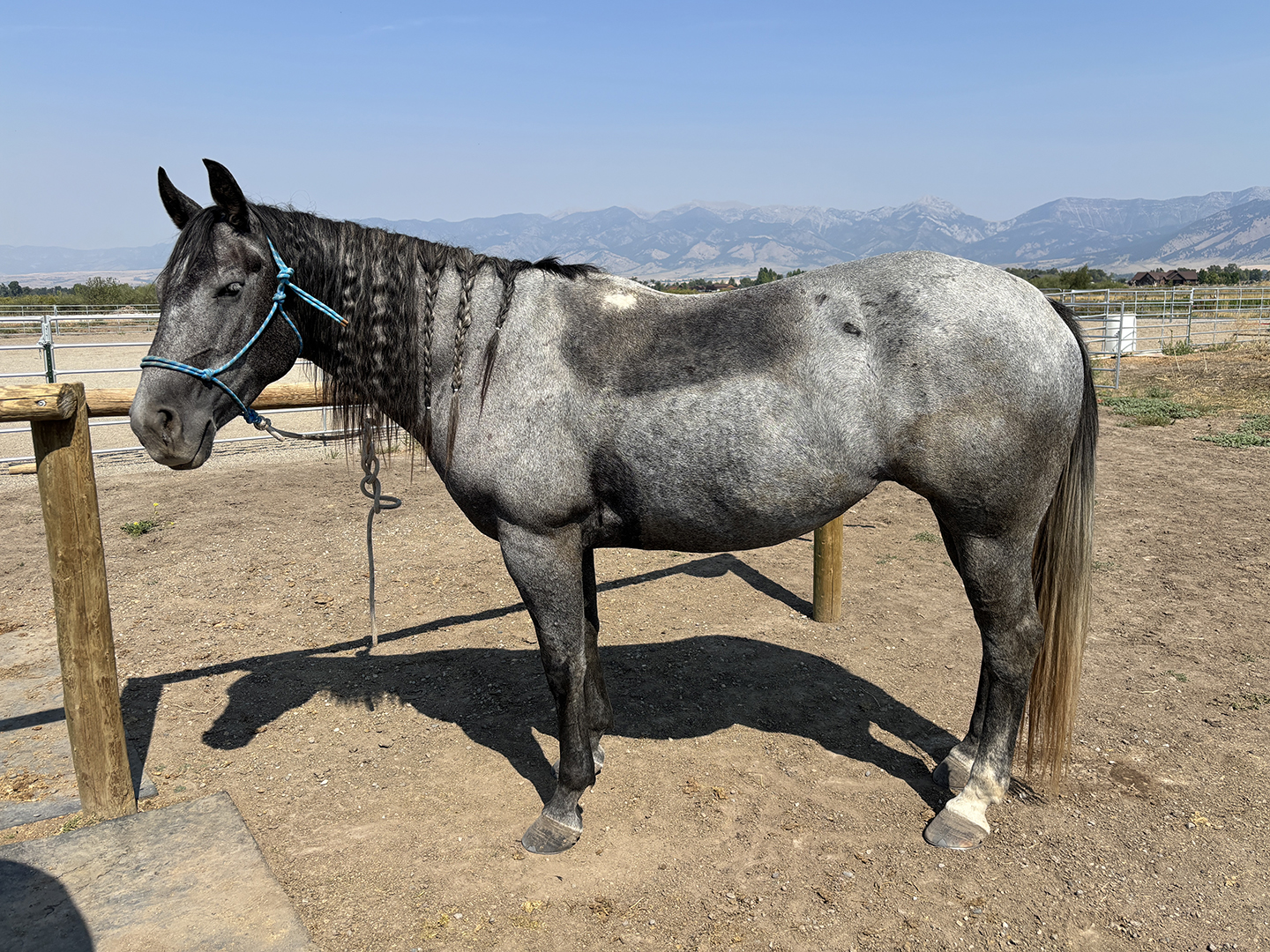 For Marie it was a childhood dream come true. She was thrilled. She explained that May, a blue roan quarter horse, was still young enough that she’d need a lot more training, but Marie felt ready for the challenge. Marie planned to initially keep May at the same barn she’d been at (only 10-15min away from Bozeman), where May could continue to hang out with her best friend, a younger, smaller horse named Peter Parker (for real, that’s his name).