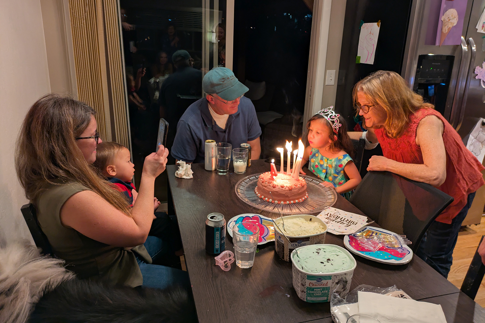 Marie and I started our trip with the day-long drive from Silver Gate to Denver, where we planned to leave our little Maltese to be spoiled by my mom while we were gone. Thanks to lucky timing, we happened to be in Denver when my niece Elizabeth’s daughter Addie turned four, and we had fun helping Addie celebrate at one of her (many) birthday parties.