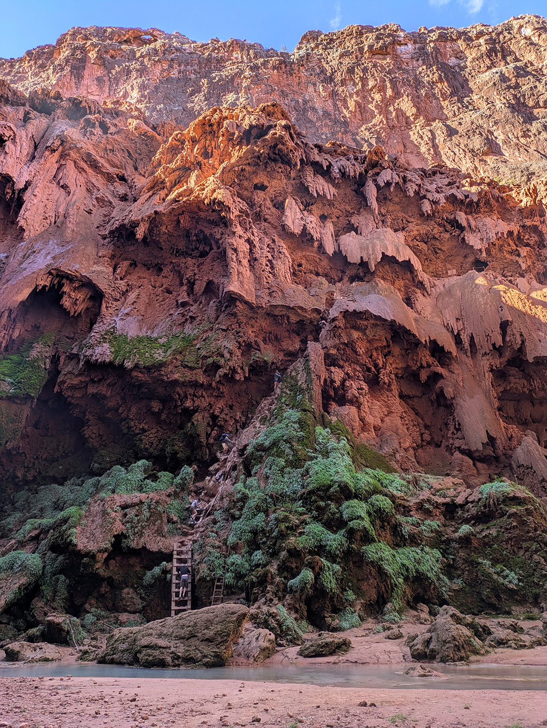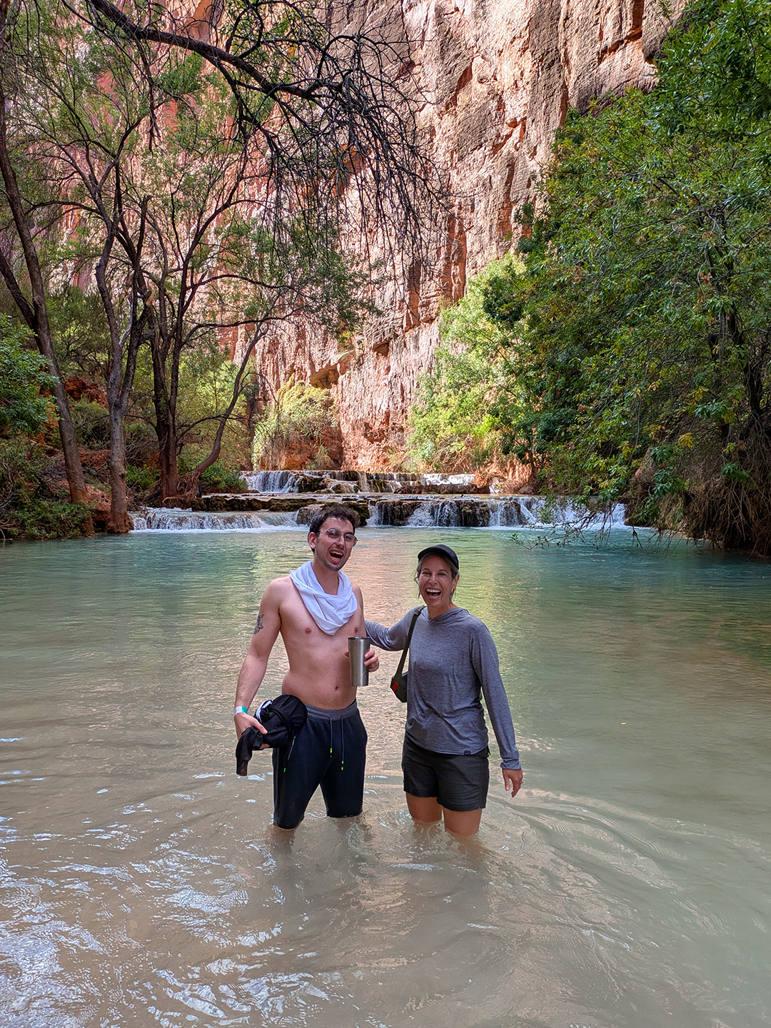 We slept reasonably well and woke up before dawn. After coffee and breakfast, as soon as there was enough light, we headed out for the hike to Beaver Falls. Just past the camping area we had a gut-check at Mooney Falls, the tallest of Havasu Creek’s waterfalls. Getting to the base of Mooney Falls and continuing down the canyon requires an alarmingly steep descent, nearly vertical in some spots. When Marie and I climbed down in 2012, she vowed, “I’m glad I did that but I’ll never do it again.” Now, 13 years later, she summoned the courage to give it one more go after all, and the four of us took the plunge. Chains had been installed in some places to provide handholds, but they were frigid and slippery from the spray of the waterfall. We tried not to think about what would happen if we lost our grip. Aidan ratcheted up the difficulty level by carrying a mug of scalding hot tea with him.