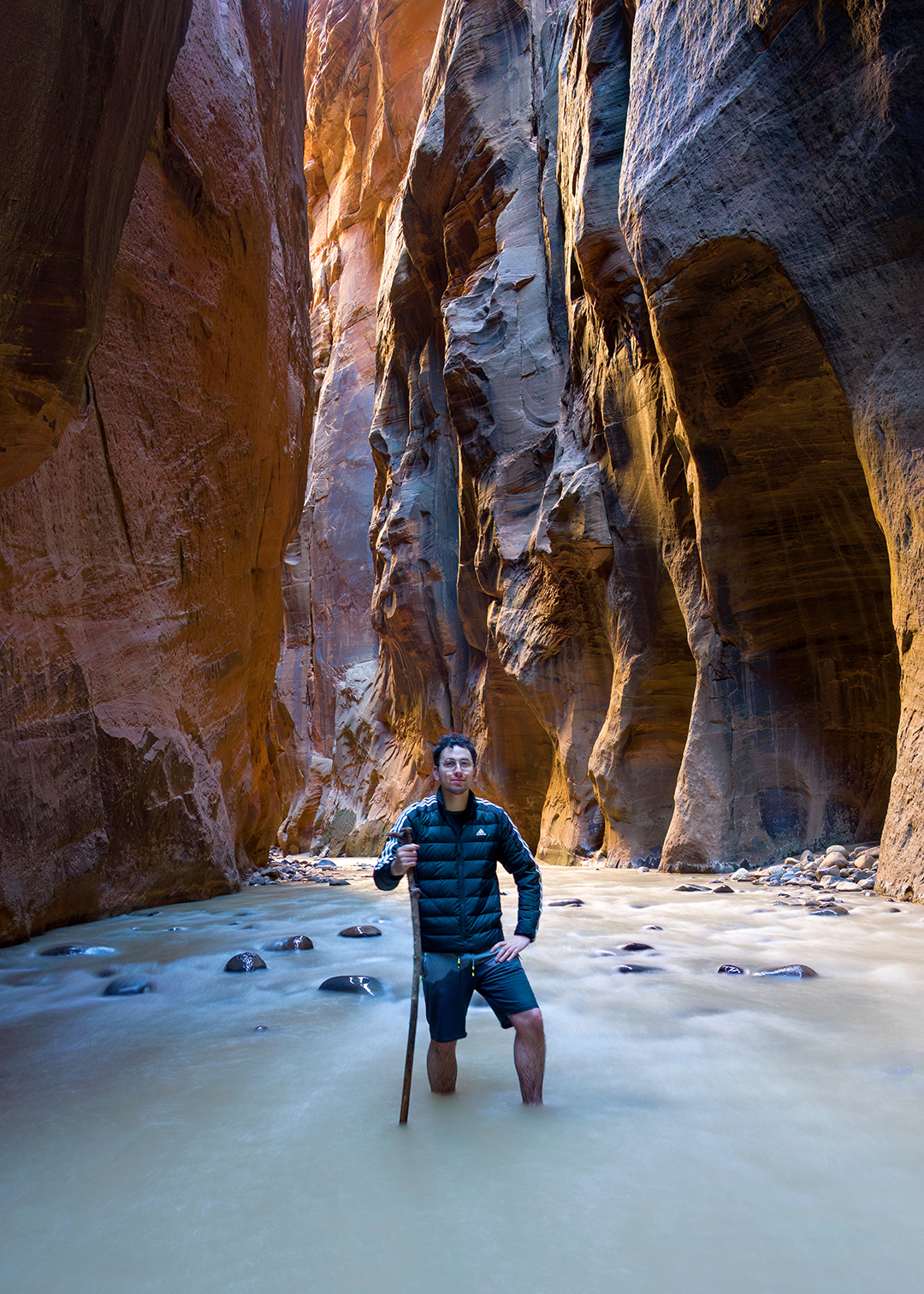As usual, I wanted to be the first to enter the Narrows so we could have it to ourselves for a while, which meant we had to race from the shuttle stop to the point where the Virgin River itself becomes the trail. The air was cold, only a little above freezing, and the icy water was murky from rainstorms earlier in the week.