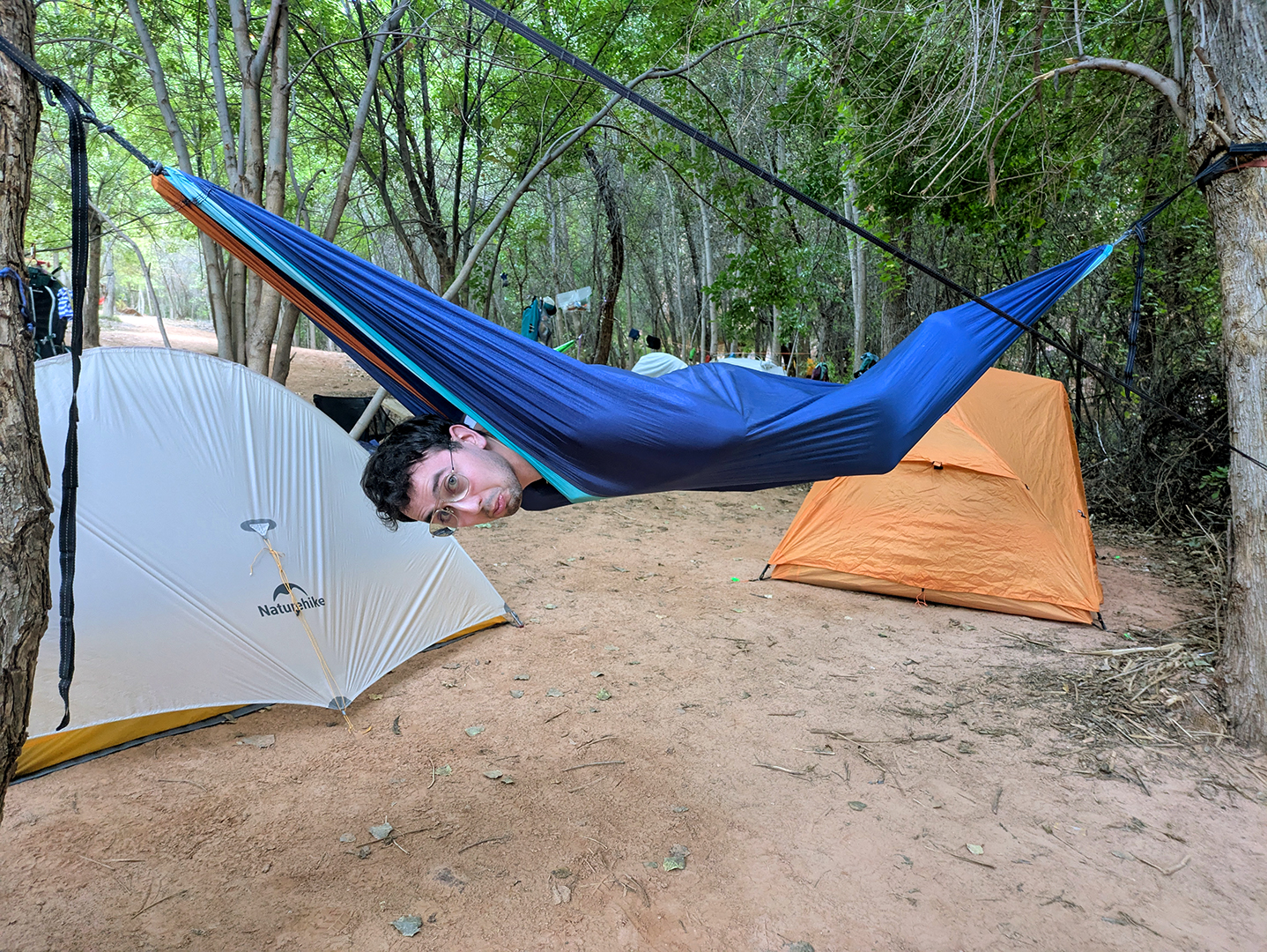 I’d been looking forward to this moment. Both Aidan and Chris are hammock aficionados, and I knew it would be fun to see Chris, the savvy veteran, and Aidan, the promising young buck, assess each other’s hammock game. As anticipated, there was a high degree of mutual respect. “Oh man that’s pro,” Chris commented as he admired Aidan’s hammocking. “That’s so pro.”